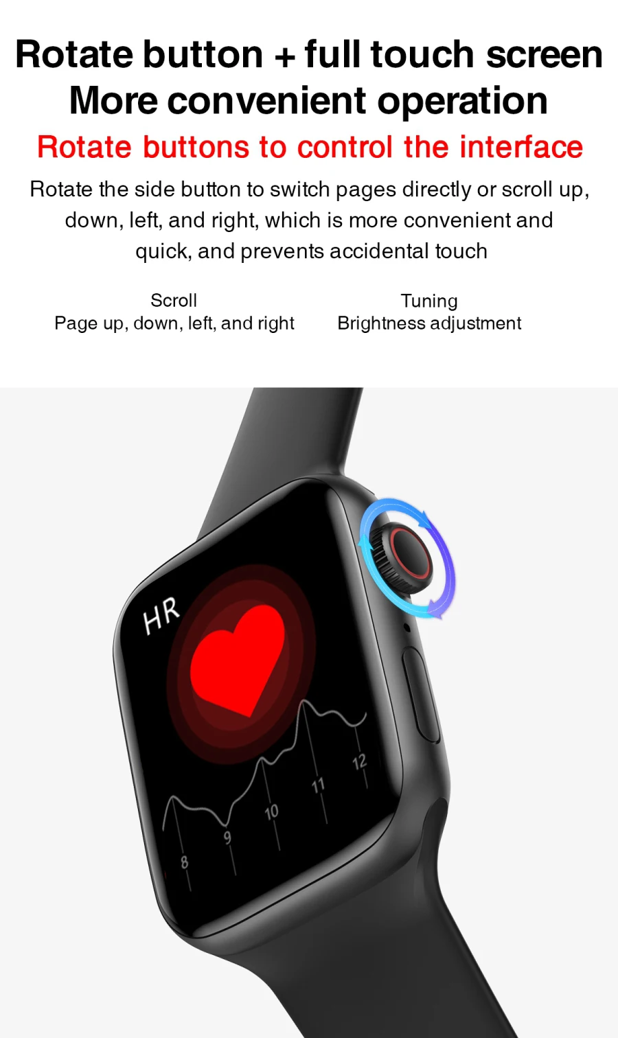 Кнопки для вращения для управления интерфейсомПоверните боковую кнопку, чтобы переключить страницы непосредственно или прокрутить вверх, вниз, влево и вправо, что более удобно и быстро, и предотвращает случайное касание