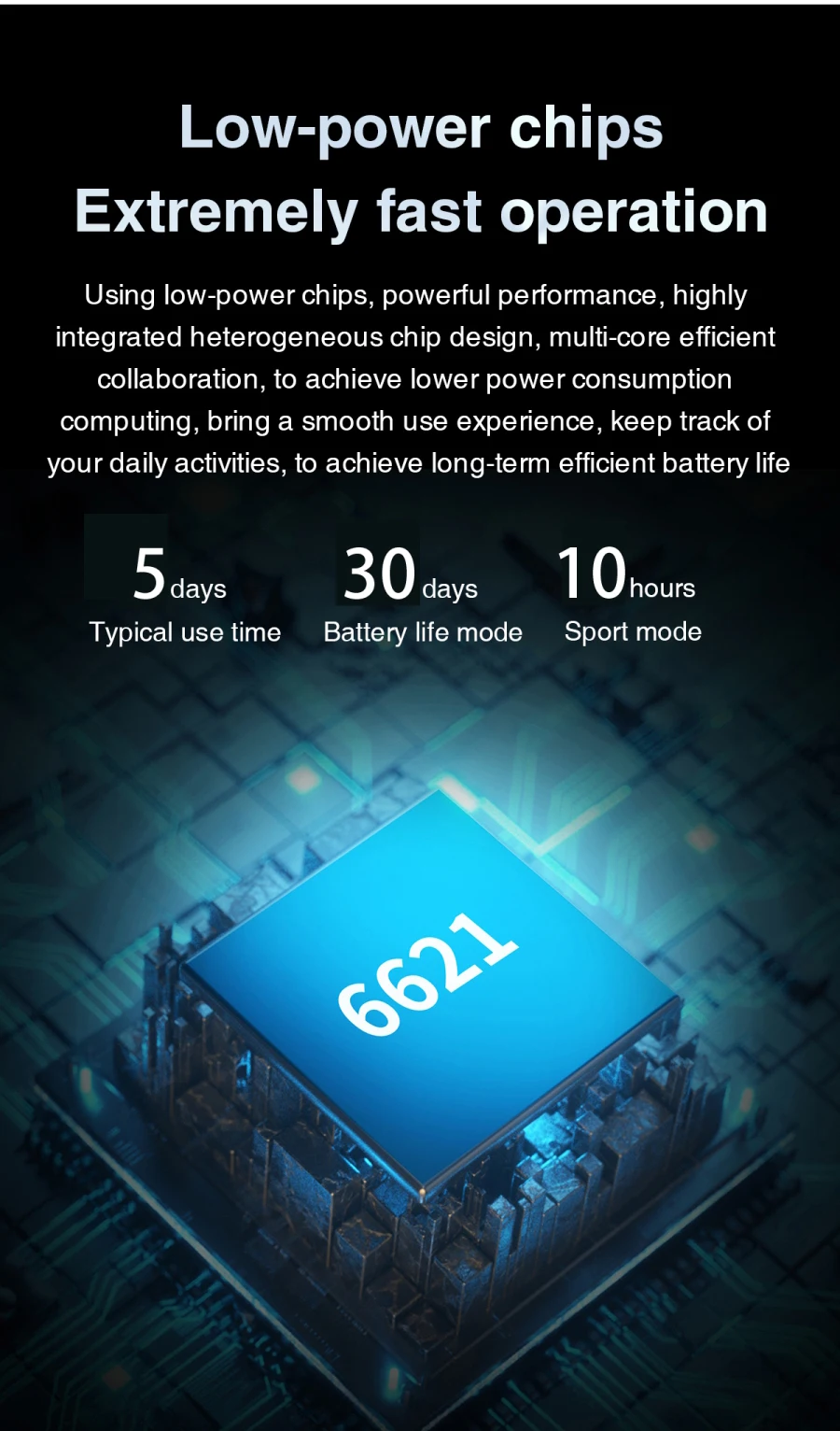 Использование низкомощных чипов, мощная производительность, высокоинтегрированная разнородная конструкция микросхем, многожильное эффективное сотрудничество, для достижения более низкого энергопотребления, обеспечивает плавное использование, отслеживает вашу повседневную деятельность, для достижения долгосрочного эффективного срока службы батареи