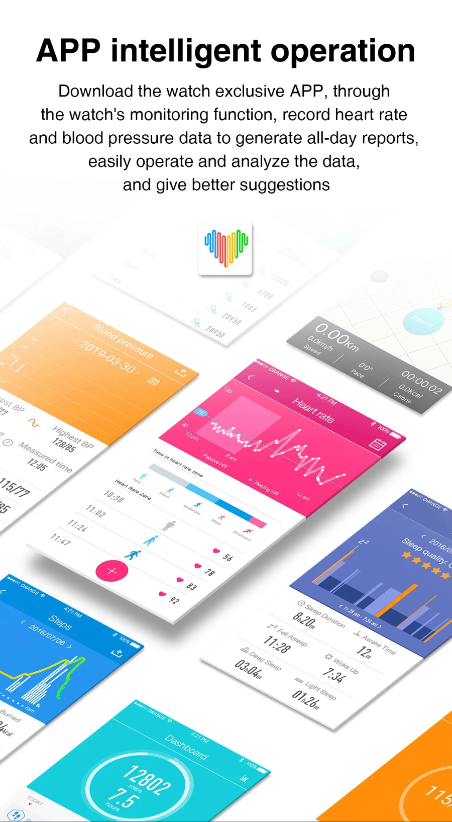 Загрузите эксклюзивное приложение для часов, используя функцию мониторинга часов, записывайте данные о пульсе и кровяном давлении, чтобы генерировать отчеты на весь день, легко управлять и анализировать данные и давать лучшие предложения