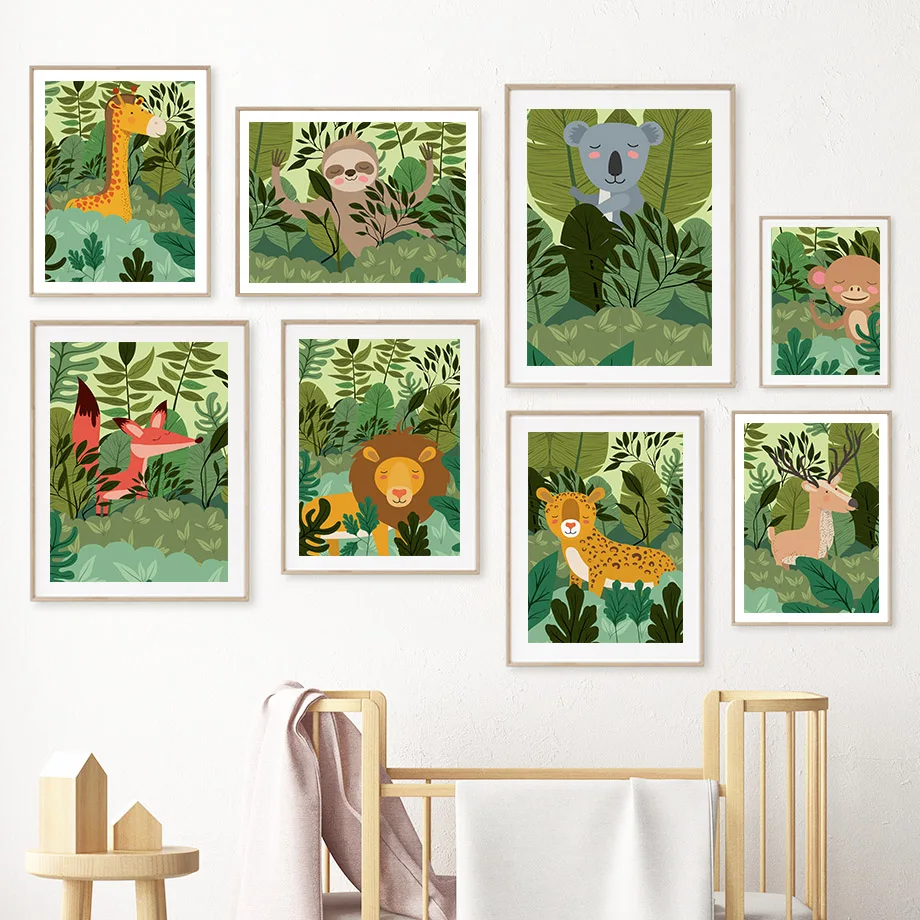 Мультяшные животные джунглей плакаты Лев лиса Леопард Обезьяна Жираф енот Настенная картина на холсте настенные картины декор для детской комнаты