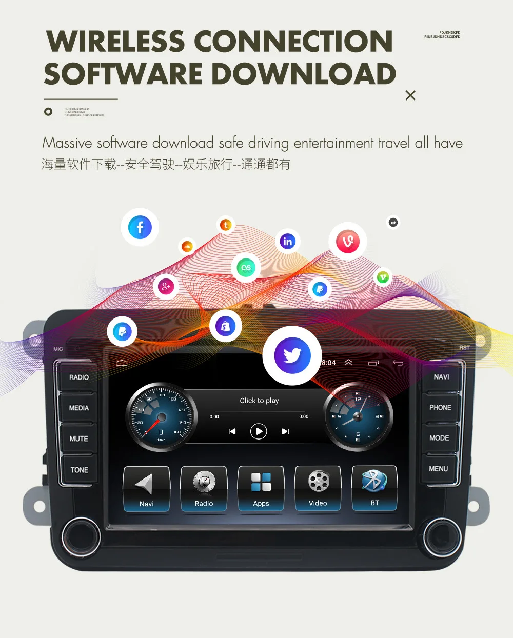 Оригинальное заводское стильное автомобильное радио для VW Passat Golf MK5 MK6 Jetta T5 EOS POLO Touran Seat Sharan7/8/9 дюймов G + G сенсорный экран; Поддержка мульти-касания; Высокое разрешение с 1024x600 пикселейAndroid10 система + 1,3G 4 ядра Процессор; 1G DDR3 и встроенный 16 Гб флэш-памяти для музыки/навигационных карт данных/видеоВстроенный 3 интерфейса пользовательского интерфейса, вы можете выбрать по своему желаниюФункция FM AM RDS: автоматический режим поиска каналов, полуавтоматический и точный метод регулировки. Слушайте музыку, новости и информацию о дорожном движении, наслаждайтесь путешествиемПоддержка зеркальной связи для смартфонаВстроенный Bluetooth 4,0 с A2DP/Hands Free/загрузка телефонной книгиВстроенный gps-приемник, совместим с Waze/Navfree/Google Map и т. д.Поддержка внешнего входа DVR: вы можете подключить автомобильную DVR камеру (продается отдельно) в этом блоке и использовать его для записи путешествия всех событийПоддержка системы заднего вида: при подключении к резервной камере автомобиля, автомобильный стереомонитор автоматически включит детали заднего вида и поможет водителю безопасно парковаться2 x Задний вход USBВстроенный WIFI, поддержка 3G/4G networМножество настроек эквалайзераРегулятор громкости/фейдера/баланса/высоких частот/басовRCA:1 канальный внешний вход для записи видео; 1 канальный видео вход; 2 канала аудио вход; 2 канала аудио выходПоддержка функции управления рулевым колесом