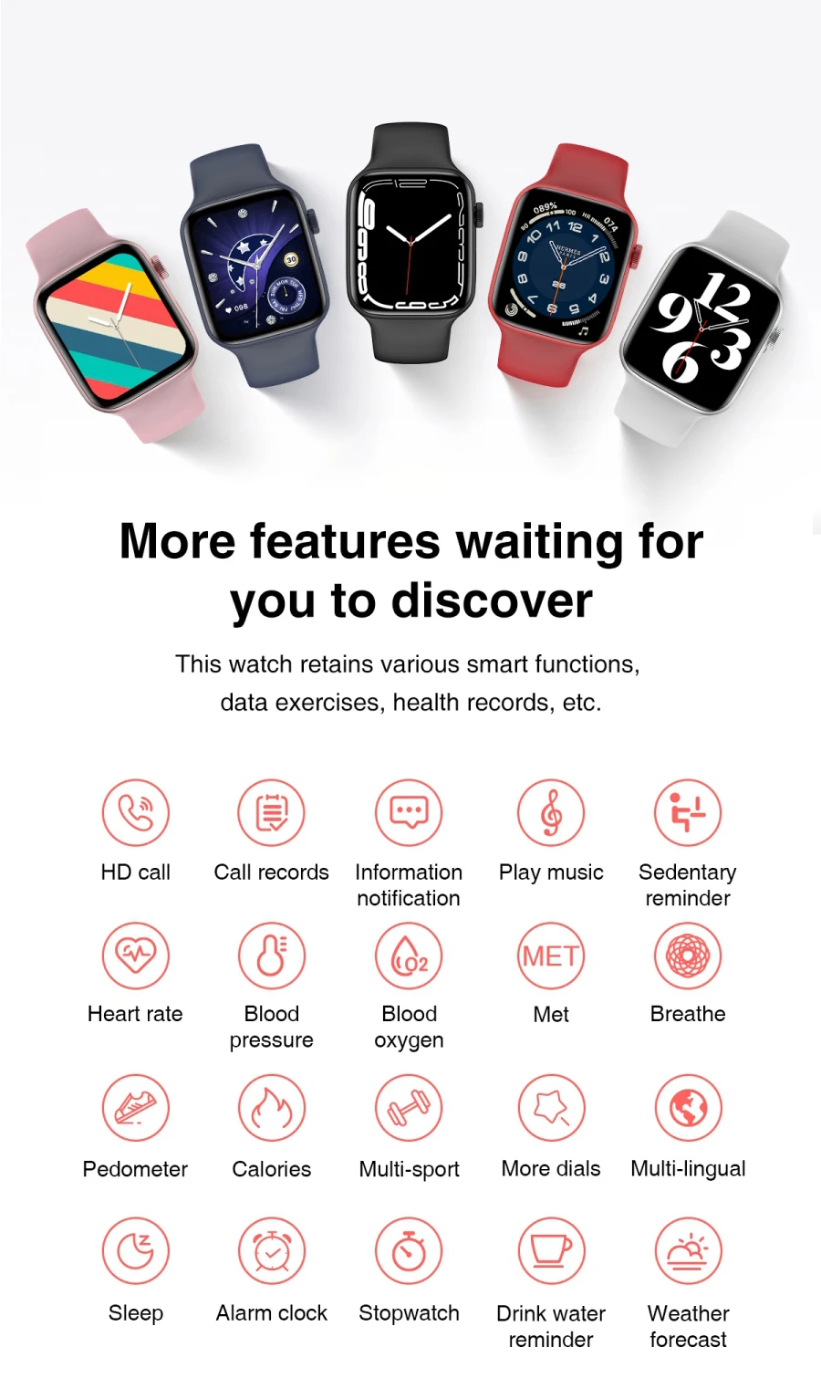 HD звонки/записи звонков/уведомления об информации/воспроизведение музыки/напоминание о сидячем положении/частота сердечных сокращений/кровяное давление/кислород в крови/встречи/дыхание/шагомер/калории/мульти-Спорт/больше циферблатов/мульти-Язычный/спящий/Будильник/Секундомер/напоминание о питьевой воде/Прогноз погоды