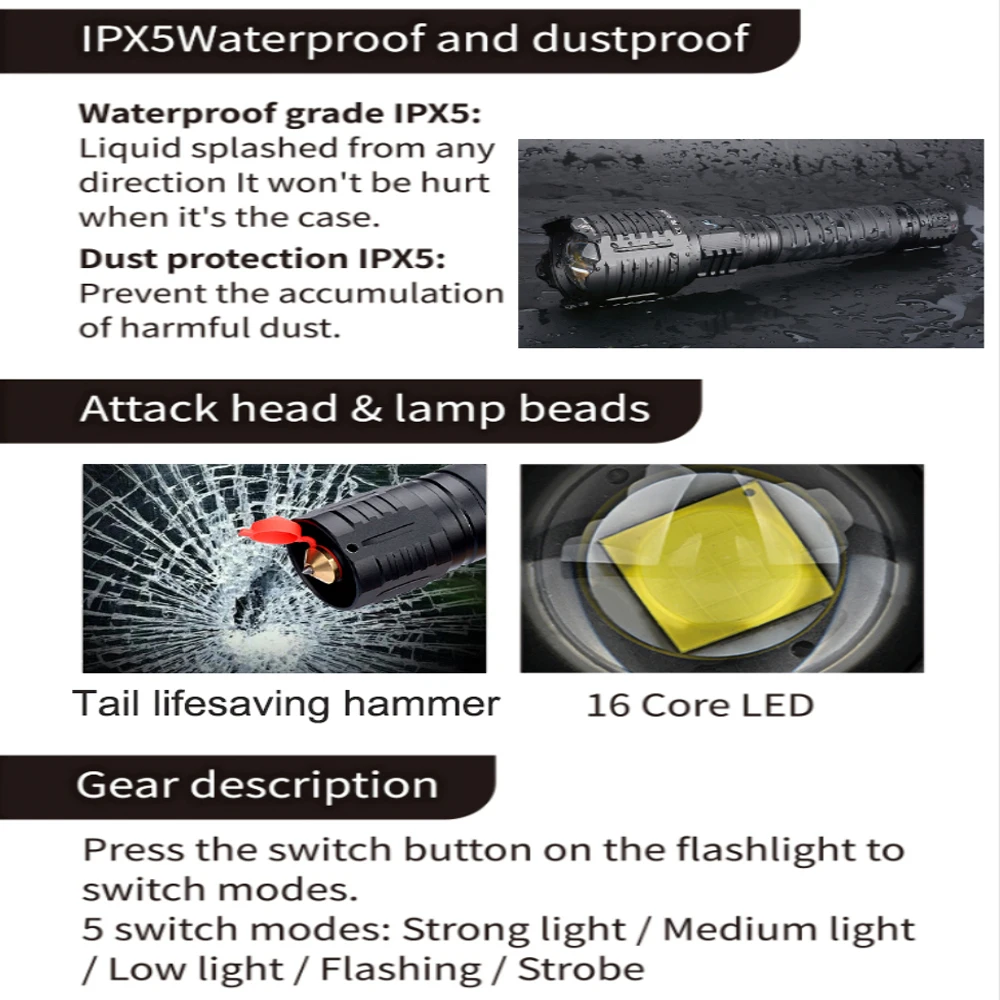 【HIGH LUMEN светодиодный фонарик 】 с использованием самого яркого XPH160 светодиодный чип с сроком службы 100000 часов, который генерирует сверхвысокий выход, это действительно портативный прожектор【Zoom adjustable & 5 lightmodes】фонарь позволяет выбрать фокус между точечным и прожекторным светом. Функциональные 5 режимов: высокий, средний, низкий, быстрый стробоскоп и медленный стробоскопический переключатель.【USB перезаряжаемая вспышка 】 встроенный Mrico входной порт, который позволяет удобно заряжать тактический фонарик. Двойные батареи 21700, емкость от 10000 мАч.【Водонепроницаемый и прочный 】 IP65-rated водонепроницаемый фонарик позволяет удобно использовать в различных экстремальных погодных условиях. Прочный корпус из сплава авиационного класса с жестким анодированным зажимом военного класса.【 100% удовлетворение Warranty】, а также беззаботное её 12-месячная гарантия и дружелюбное обслуживание клиентов при условии.