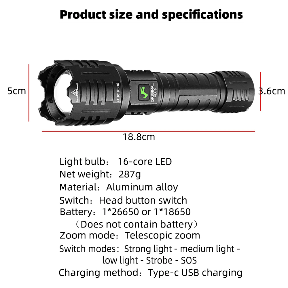 [Модель лампы]: 16-core светодиодный[Материал линз]: оптическая выпуклая линза[Рабочая передача]: 5 режимов: сильный, средний, слабый, мигающий, SOS[Применимый аккумулятор]: аккумулятор 26650 (без аккумулятора)[Водонепроницаемость]: IPX5 (водонепроницаемость, защита от дождя)[Мощность продукта]: 50 Вт[Материал изделия]: алюминиевый сплав[Рабочее напряжение]: 3,7 V[Цвет товара]: черный[Можно осуществлять прямую зарядку]: TYPE-C прямое Зарядное устройство USB (с выходом и двумя входными интерфейсами)[Фокусировка]: Телескопический фокус[Положение переключателя]: Средний кнопочный переключатель[Дисплей питания]: переключатель имеет функцию отображения мощности. Зеленый светильник указывает на то, что мощность достаточно, а красный светильник указывает на то, что мощность низкая, и ее нужно заряжать.[Подсказки для зарядки]: при зарядке светильник на кнопке мигает красным и становится зеленым