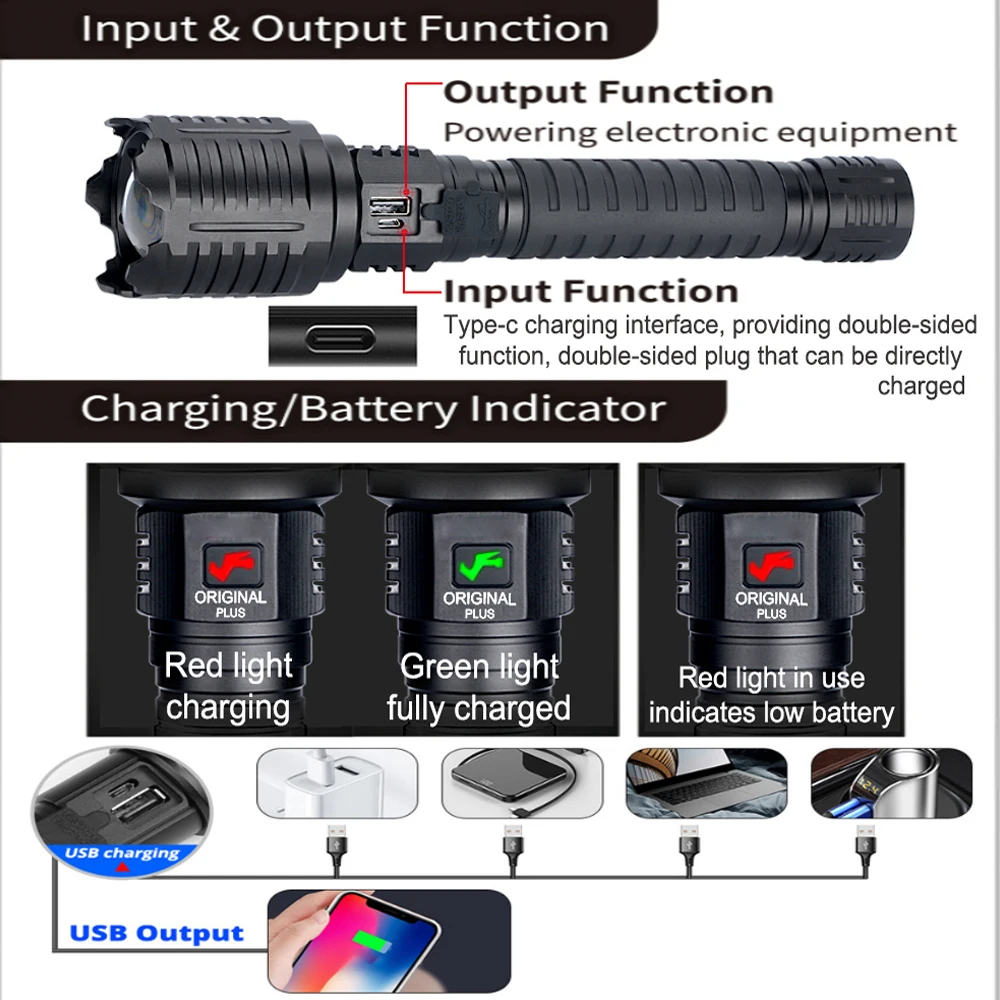 Новая быстрая зарядка через USB Type-c, увеличивает выходную функцию, может использоваться в качестве банка мощности для зарядки телефона, увеличивает объектив, широкий диапазон освещения, переключает дисплей питания, В режиме реального времени обзор состояния питания, противоскользящие линии на бочке, головная головка1,16 Основная лампа бисер, высокая яркость до 5800 люмен, срок службы 100000 часов;2. Выпуклая линза: большая выпуклая линза Eagle eye, выпуклая линза, хороший светильник, производительность передачи, не легко повредить, прочная алюминиевая ударная головка для защиты объектива от износа3. Телескопический зум: растяните голову влево и вправо, чтобы увеличить, режим астигматизма-концентрации, удобный для использования в различных ситуациях;4. Средний переключатель: высококачественный натуральный каучук материал, нескользящая поверхностная обработка, светильник сенсорный переключатель для включения светильник ing для переключения режима переключения5. Контакт батареи: контактная конструкция батареи имеет хорошую электропроводность и эффективно предотвращает плохой контакт.