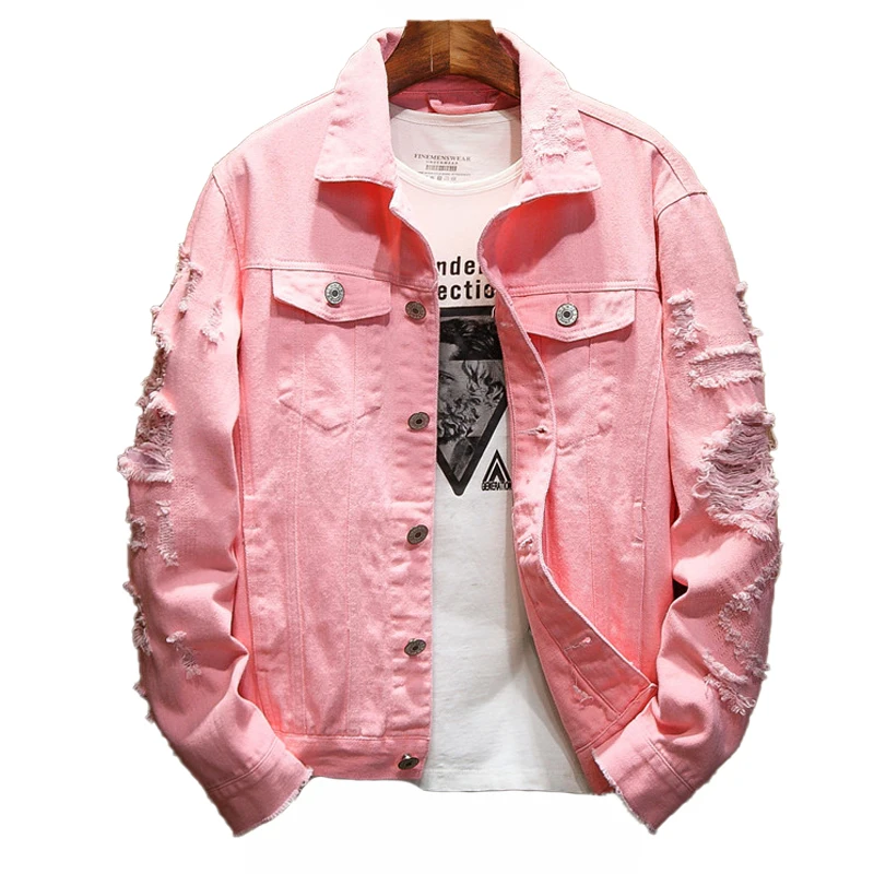 Мужская джинсовая куртка, розовая Потертая джинсовая куртка с дырка...