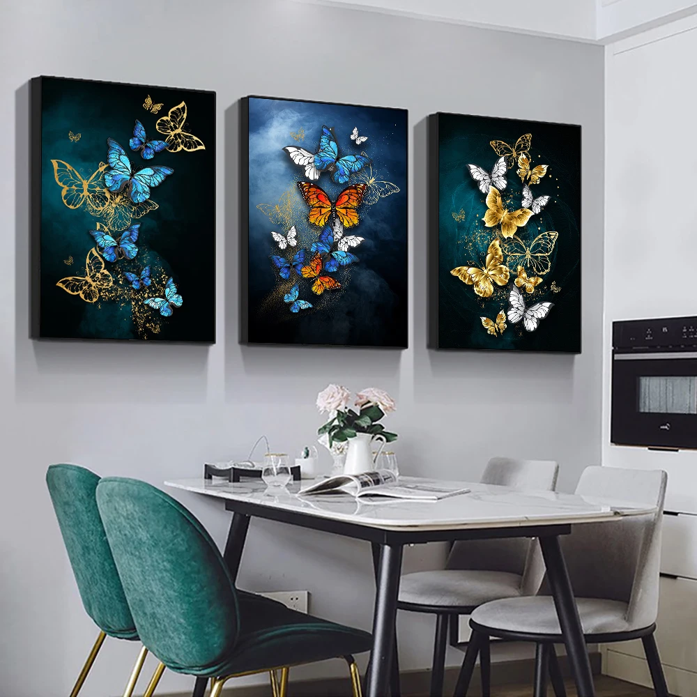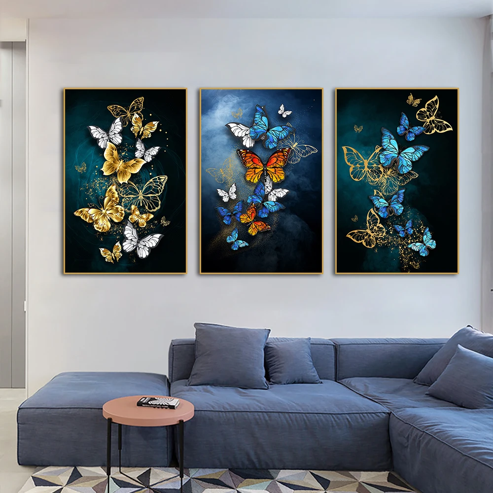 3 панельные абстрактные синие золотые бабочки Холст Картина скандинавские современные постеры с животными и принтами настенная живопись для украшения дома