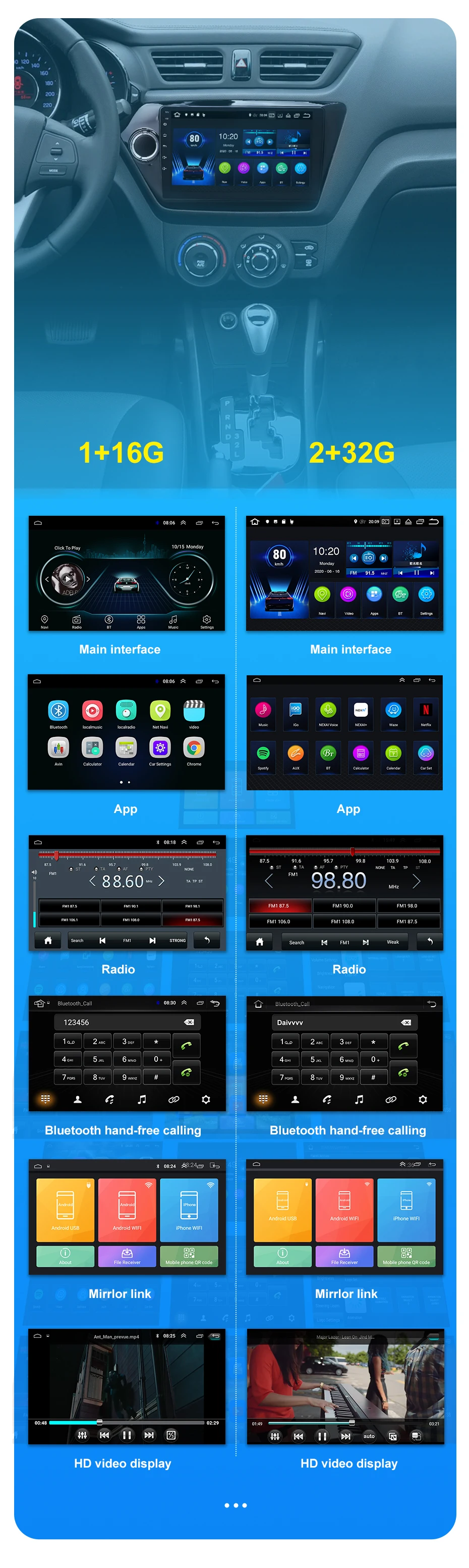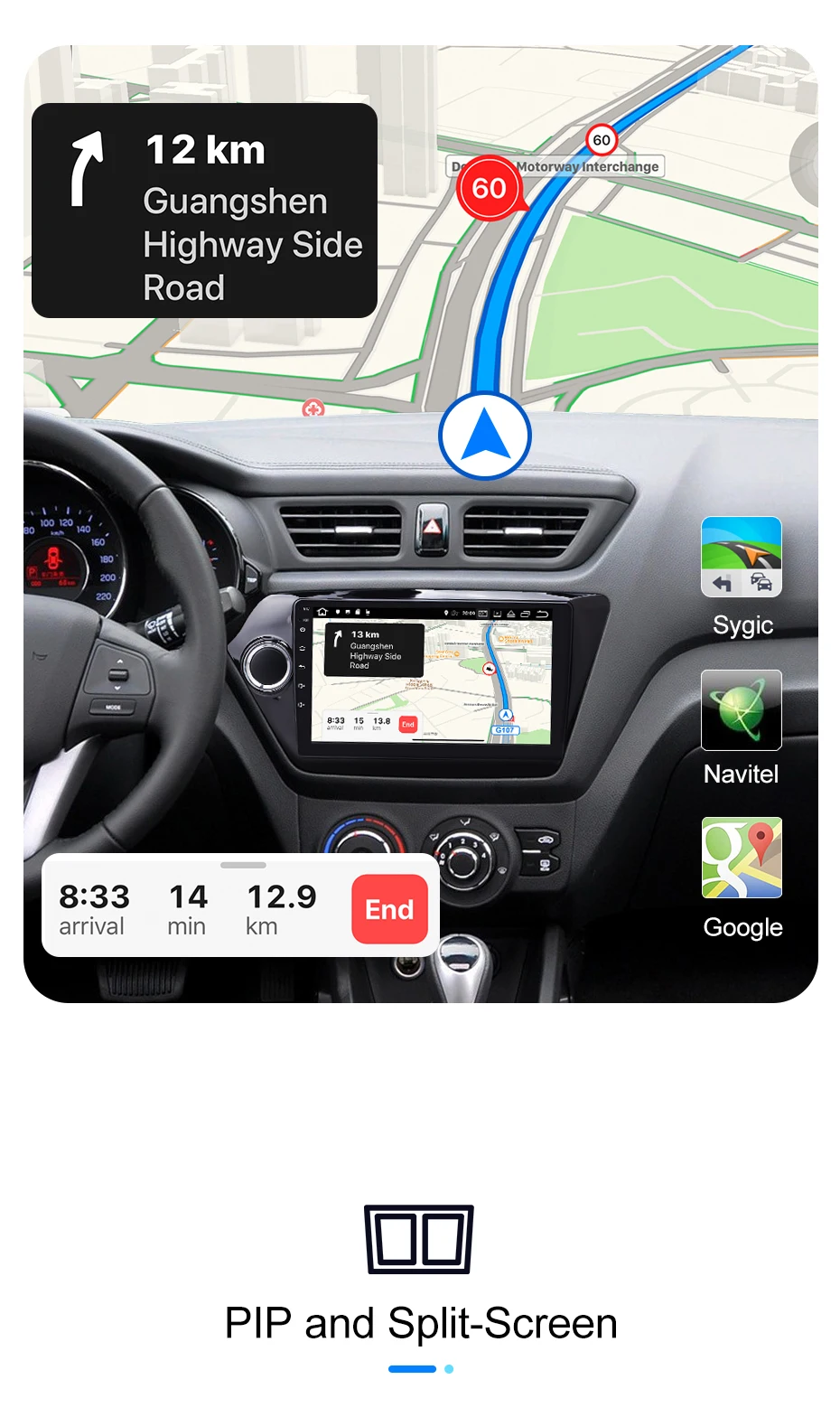 Картинка в картинке и разделенный экран>>> Видео всегда отображается во вложенных окнах, вы можете установ ить размер видеоинтерфейса по своему усмотрению.>>> Экран головного устройства может отображать два приложения одновременно. (не может одновременно отображать два аудио приложения)