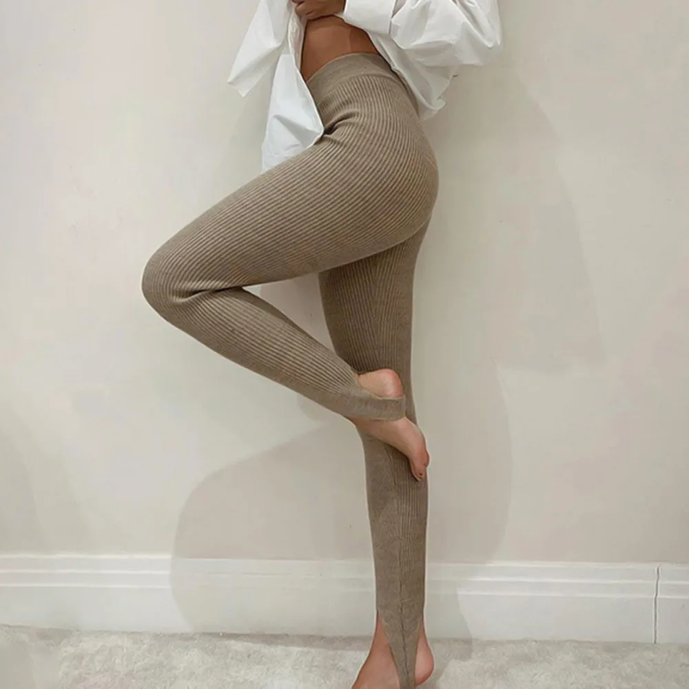 Женские бежевые трикотажные леггинсы в рубчик с высокой талией, хлопковые базовые брюки для фитнеса, повседневные универсальные облегающие леггинсы на весну и осень