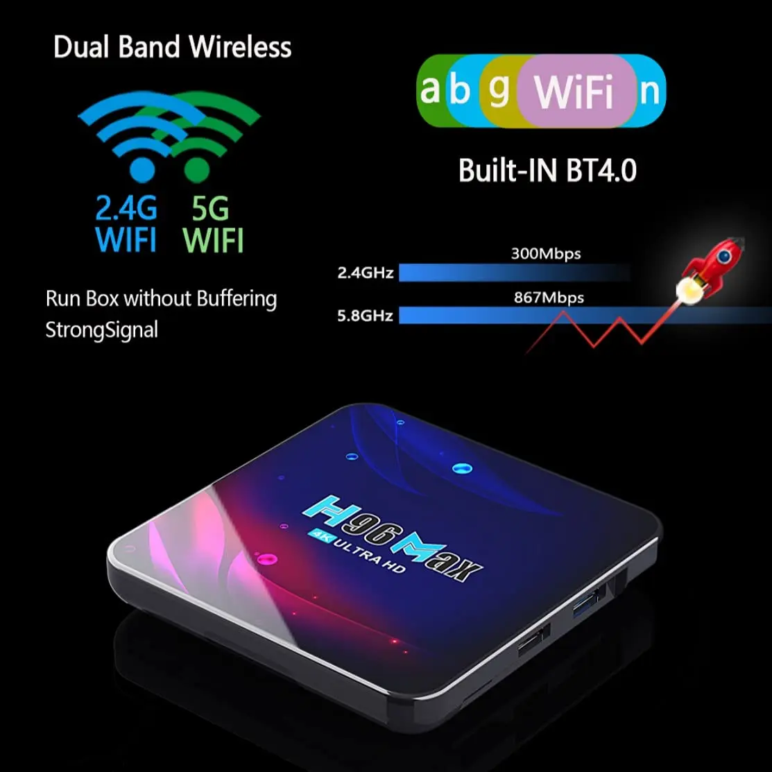 Двойной USB 2,0: ТВ-бокс имеет двойной порт USB 2,0 и USB 3,0, быстрый и стабильный. Подключите ТВ-бокс к телевизору, подключите и играйте, наслаждаясь удобством и удовольствием.