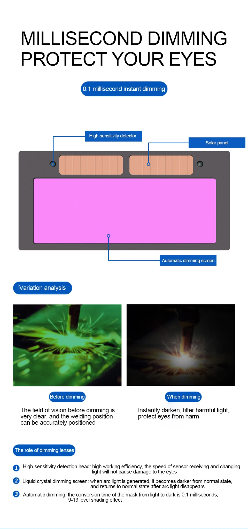 1. Высокое качество: Использование высококачественного PE материала, он более устойчив к падению, высокой температуре, хорошей теплоизоляции, предотвращает ожоги на лице и имеет более длительный срок службы.2. Автоматическая регулировка яркости (только для шлем с автоматическим затемнением модель): Автоматическое затемнение сварочные маски, защитить ваши глаза, высокая чувствительность обнаружения, обнаружения скорость светильник изменения. Поле зрения очень четкое перед затемнением, и положение сварки можно точно расположить. При затемнении он мгновенно станет темным, фильтруя вредный светильник и защищая глаза от вреда.3. Регулируемая: Сварочная маска может быть перевернута вверх и вниз, а герметичность повязки может быть скорректирована во время использования.Уплотненная губка4. Утолщенная губка для лба эффективно защищает лоб от травм, удобно впитывает пот и не скользит.Комплексная защита5. Комплексная защита, но не блокирует обзор, сварка более эффективна и удобна.