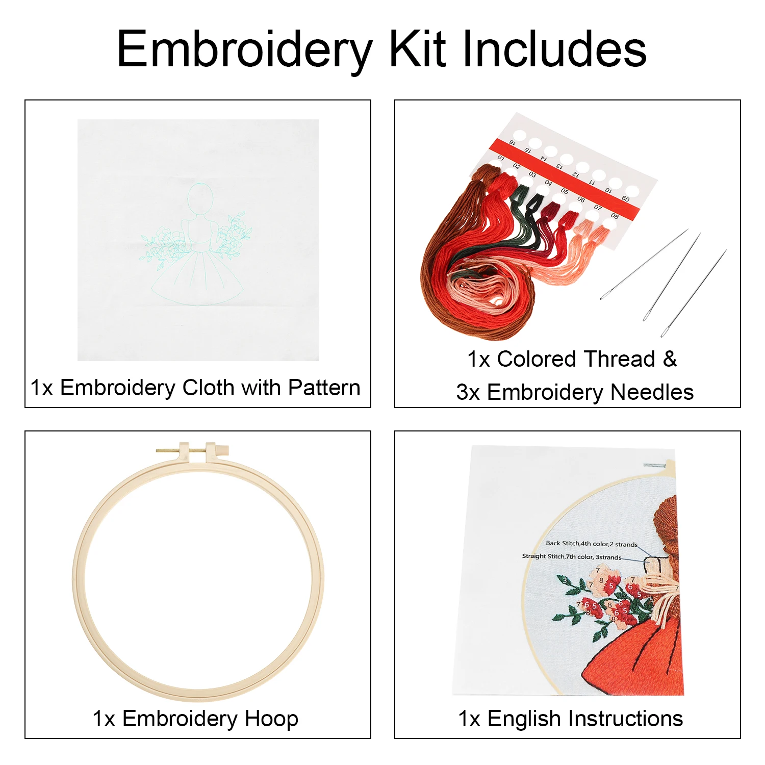 1x ткань для вышивки с рисунком1 цветная карта для нити1x Инструкция на английском языке1x обруч с вышивкой3x иглы для вышивки