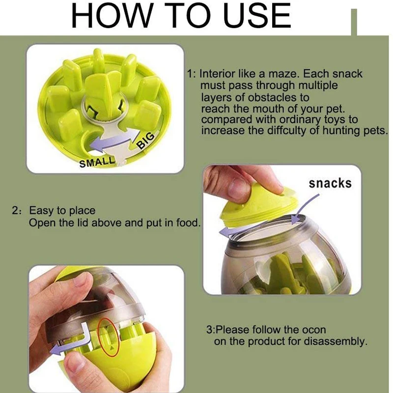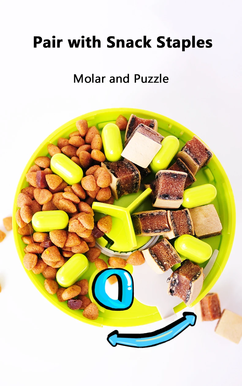 1. Интерьер как лабиринт. Каждая закуска проходит через несколько слоев препятствий, чтобы добраться до рта вашего питомца. По сравнению с обычными игрушками для увеличения сложности охоты на домашних животных.2. Легко разместить, открыть крышку сверху и положить в еду.3. Здесь есть две отметки на игрушке, когда вы собираете две части. Просто нужно выровнять две отметки, а затем повернуть