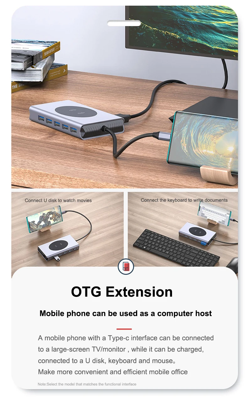 Важное примечание -При подключении к ноутбуку Не поддерживайте зарядку мобильного телефона через USB-A или USB-C женский порт из-за ограниченного тока. -Чтобы использовать выходной порт HDMI, хост USB-C порт от вашего устройства должен sup port Display port Alt Mode. -Пожалуйста, предоставьте источник питания при подключении к энергоемким устройствам; Поддержка подключения только 1 HDD/SSD одновременно. -Чтобы предотвратить помехи Wi-Fi, вы можете обернуть корпус линии рядом с портом type-c фольгой или с помощью маршрутизатора частоты 5 ГГц. Кроме того, При неиспользовании отключите ethernet-кабель и PD зарядный кабель от адаптера. -Для ноутбуков Xiaomi мы предлагаем подключение к неоригинальному адаптеру питания PD, например, к адаптеру питания Apple, Dell для обеспечения нормального использования.
