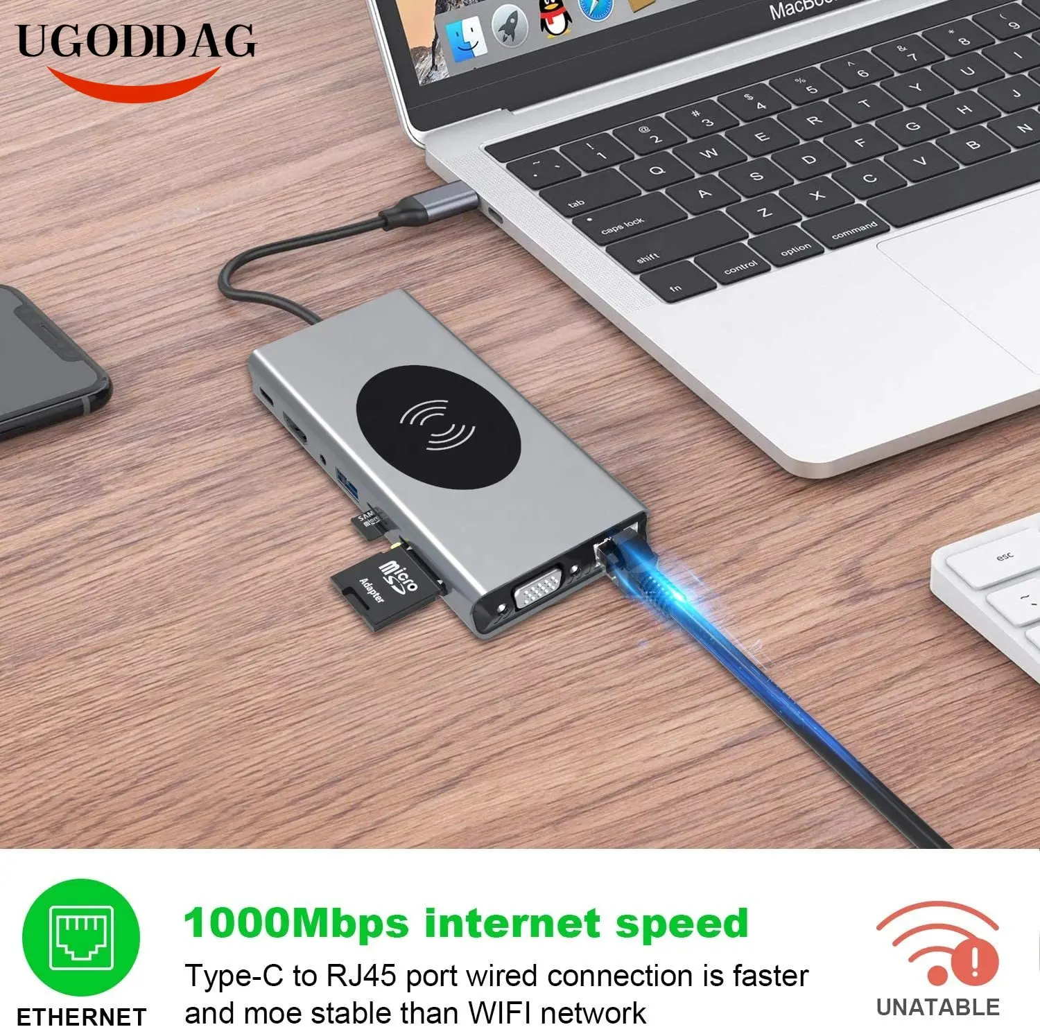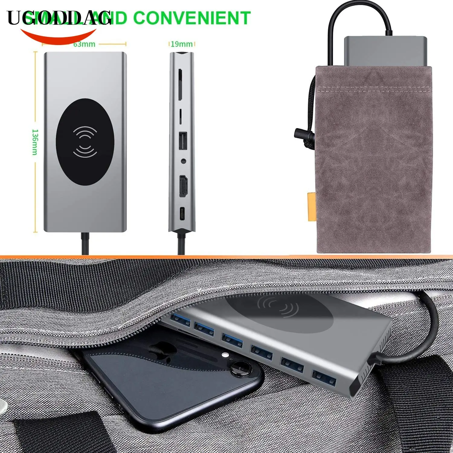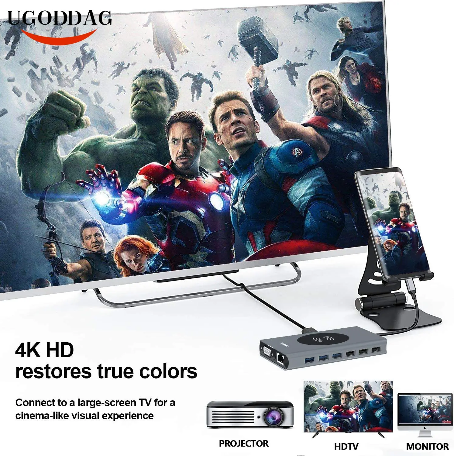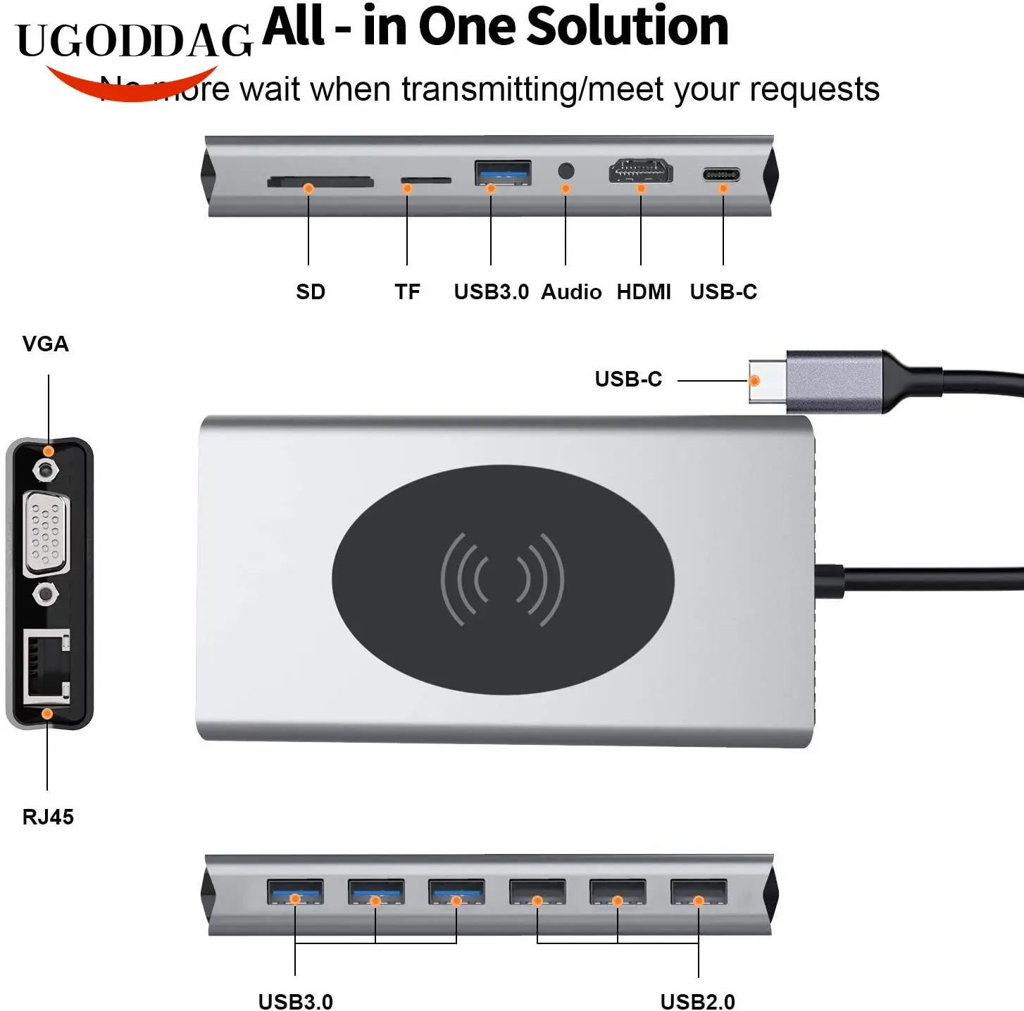 【 15 в 1 POWEREXPAND + 】: подключи и работай, этот usb-хаб Type-C совмещает функцию USB c Hub и док-станции, он оснащен 15 портами с 4K @ 30Hz HDMI портом/VGA портом/беспроводным зарядным устройством/SD/TF кардридером/3 * USB 3.0 Порты/4 * USB 2,0,/Тип C PD зарядки (зарядка только)/3,5 мм аудиоразъем/Gigabit Ethernet, которые могут использоваться одновременно.