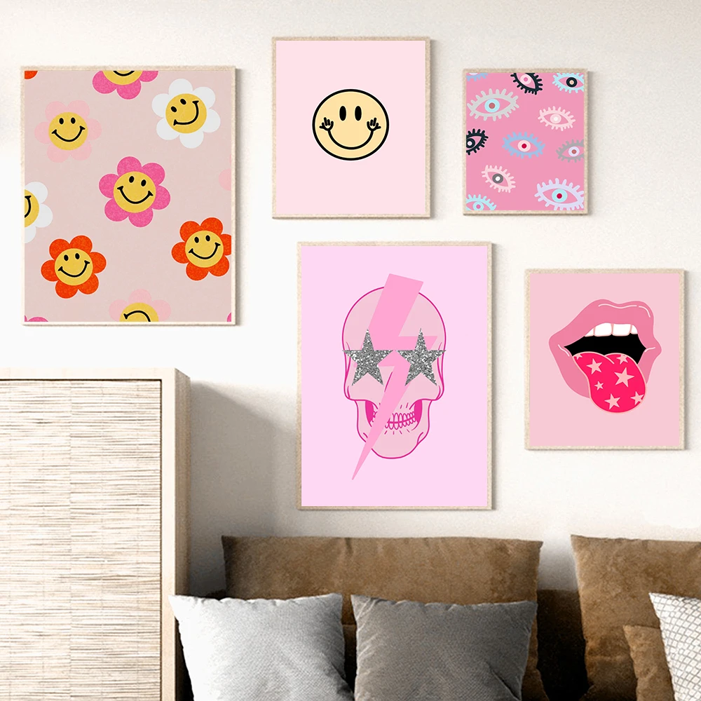 Настенный Декор для дома, розовый леопард, гепард, постер с художественной печатью в стиле преппи для спальни, Современная Картина на холсте с улыбкой, губами, глазами, картина для спальни, настенные картины