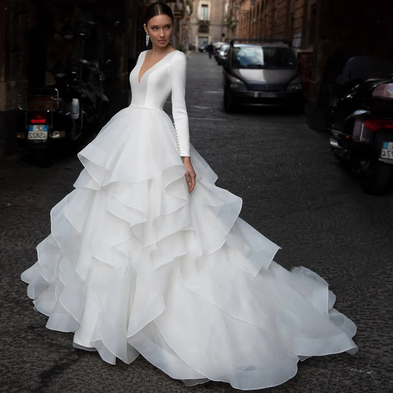 Белое пляжное свадебное платье с V-образным вырезом и длинным рукавом, с оборками, из органзы, со шлейфом, свадебное платье принцессы, элегантное женское свадебное платье