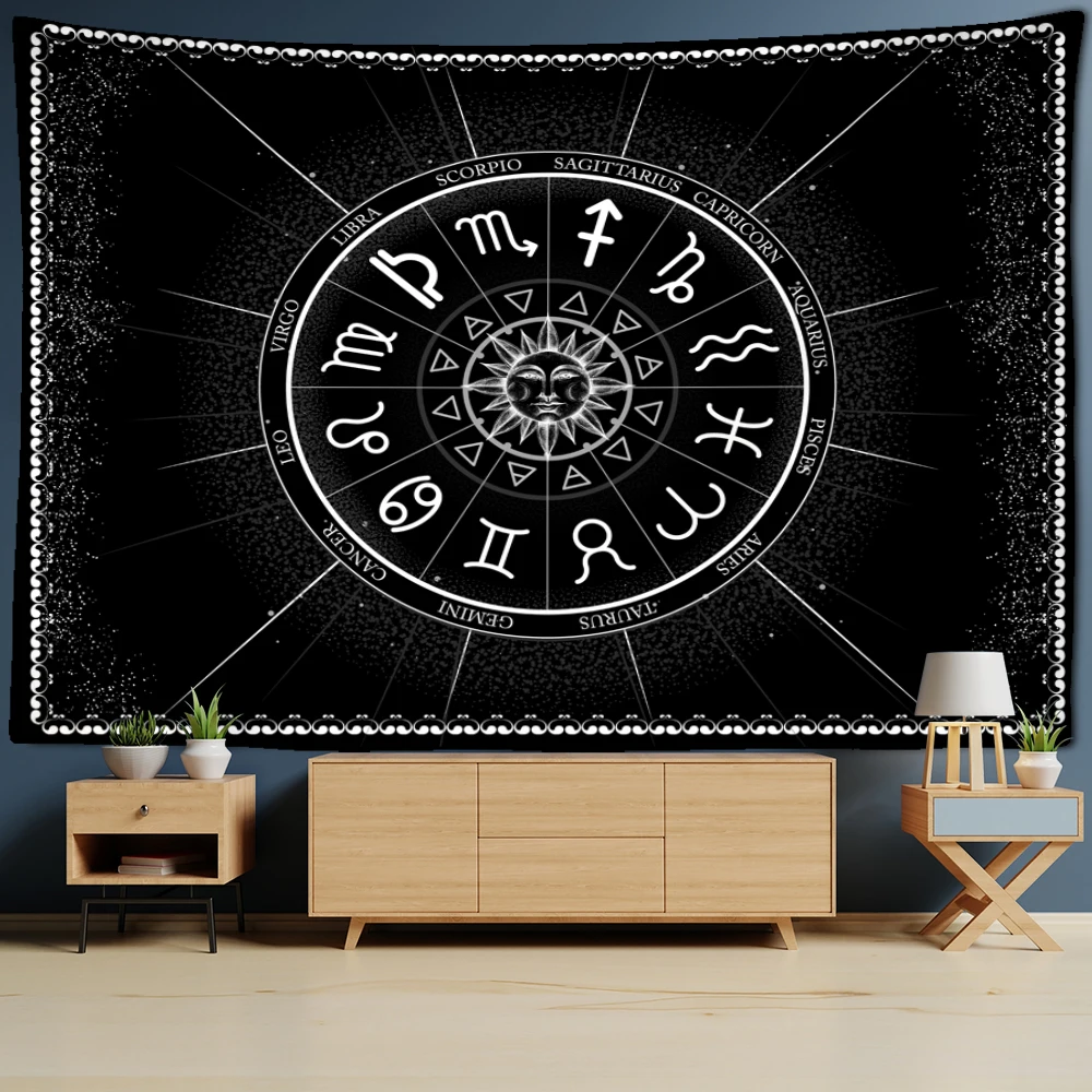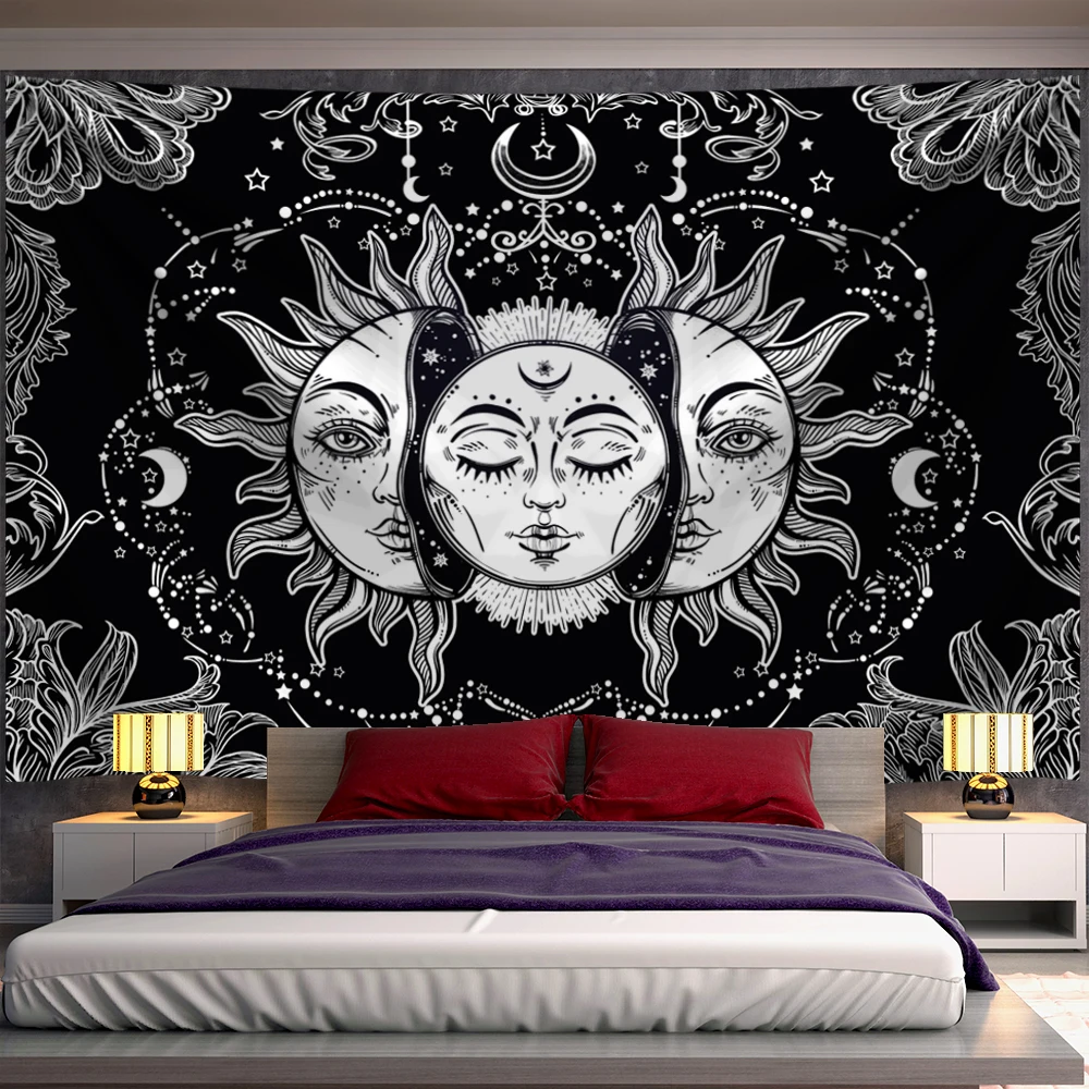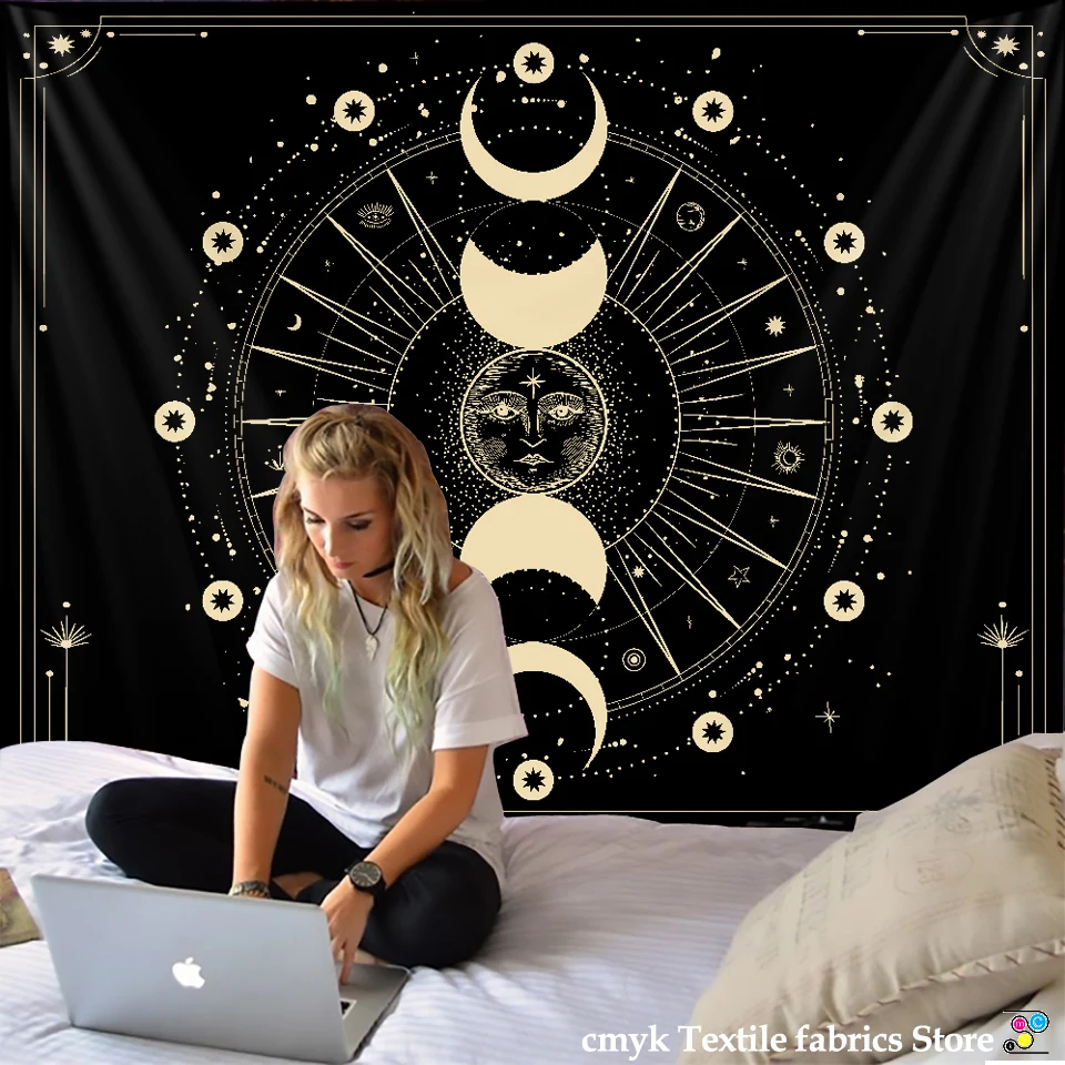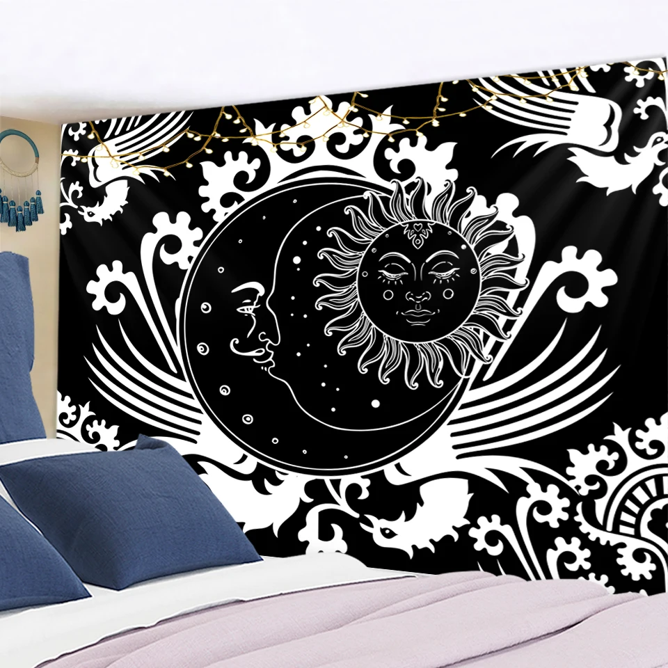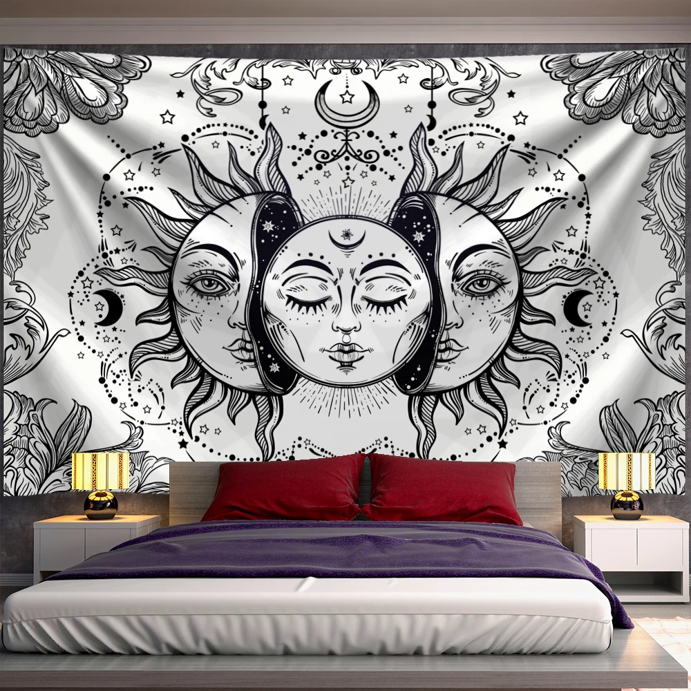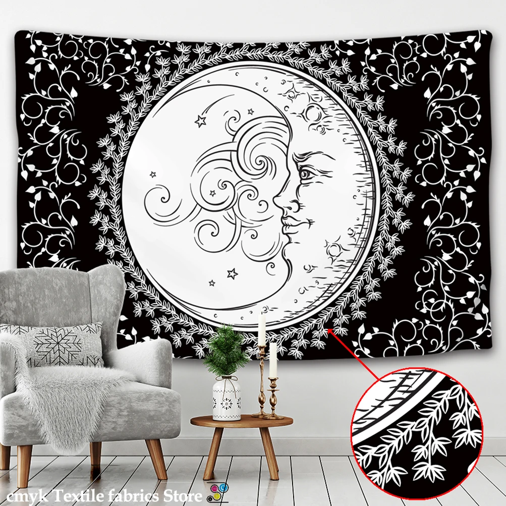 Белый черный гобелен с рисунком солнца, Луны, мандалы, настенный гобелен в стиле хиппи, настенные ковры, декор для спальни, психоделический гобелен