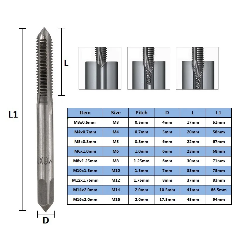 Набор резьбы для правой и прямой флейты M3 M4 M5 M6 M7 M8 M10 M12 M14 M16 метрический инструмент для нарезания резьбы сверло