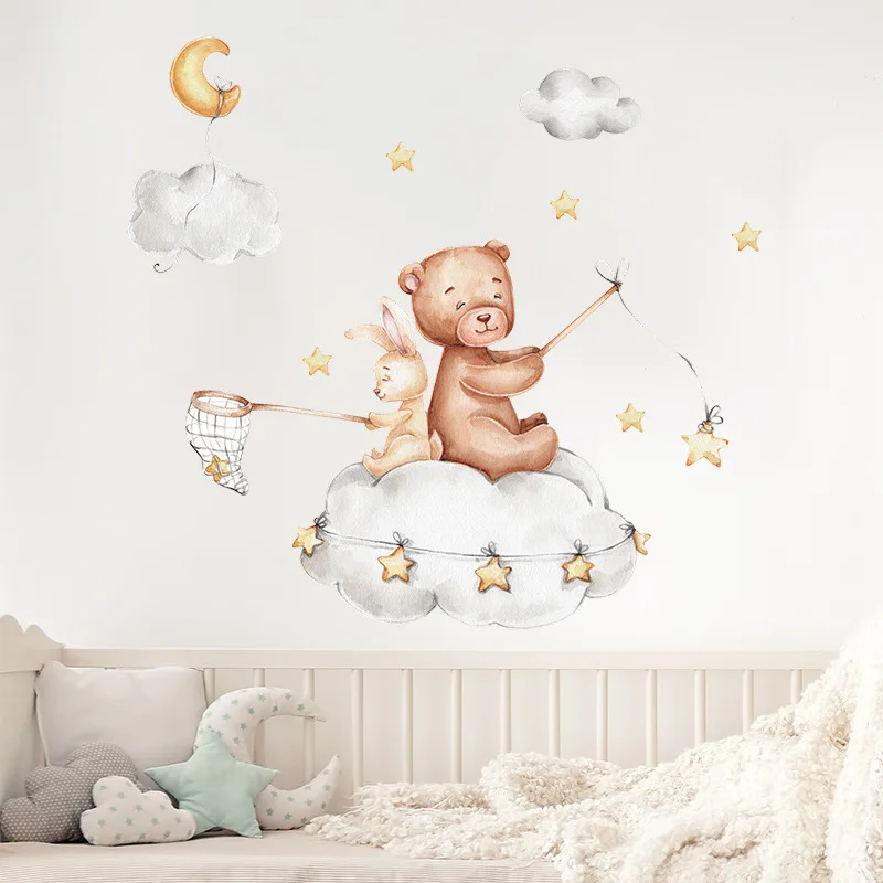 Наклейки на стену с изображением медведя кролика Звезды Луны для детской комнаты, украшения дома, обои для гостиной, спальни, наклейки для детской комнаты, Мультяшные наклейки