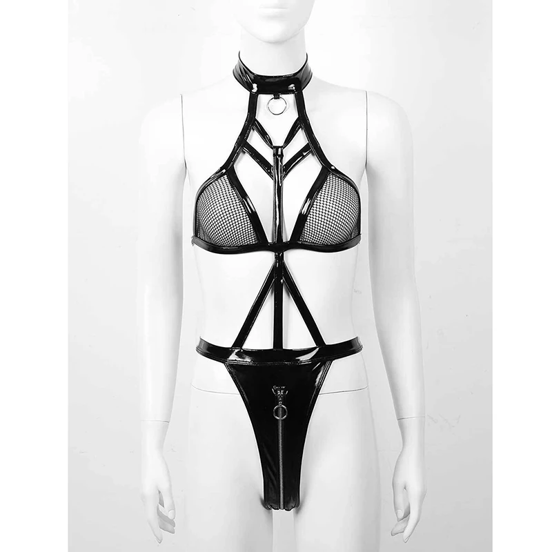 Соблазнительное нижнее белье, соблазнительное Сетчатое кожаное ажурное бикини на молнии, Сетчатое прозрачное облегающее нижнее белье, эротическое женское боди
