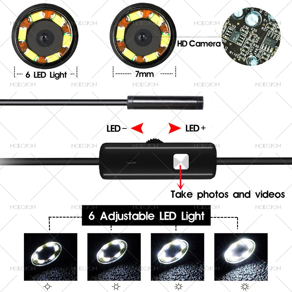 ● Длина кабеля: 1 м, 2 м, 3,5 м, 5 м, 10 м опционально● Стиль Кабеля: мягкий и жесткий кабель на выбор● Диаметр линзы: 7 мм● Светильник: 6 шт. регулируемый светодиодный светильник• Фокусное расстояние: 3 см-10 см (1,18-3,94 дюймов)● Уровень водонепроницаемости: IP68● Разрешение: 640*480● Угол обзора: 70 °● Система поддержки: для Android/для Windows 2000/для XP/для Vista/для Windows 7/8/10● Usb-порт: Micro USB/Type-C/USB● Размер датчика: 1/5 дюйма● Частота кадров: 30 кадров в секунду● Источник питания: 5 В постоянного тока через USB● Формат фото: JPEG● Формат видео AVI