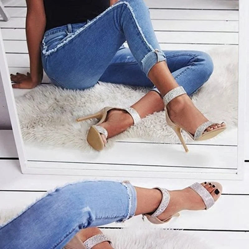 Босоножки женские на высоком каблуке, пикантные сандалии с блестящи...