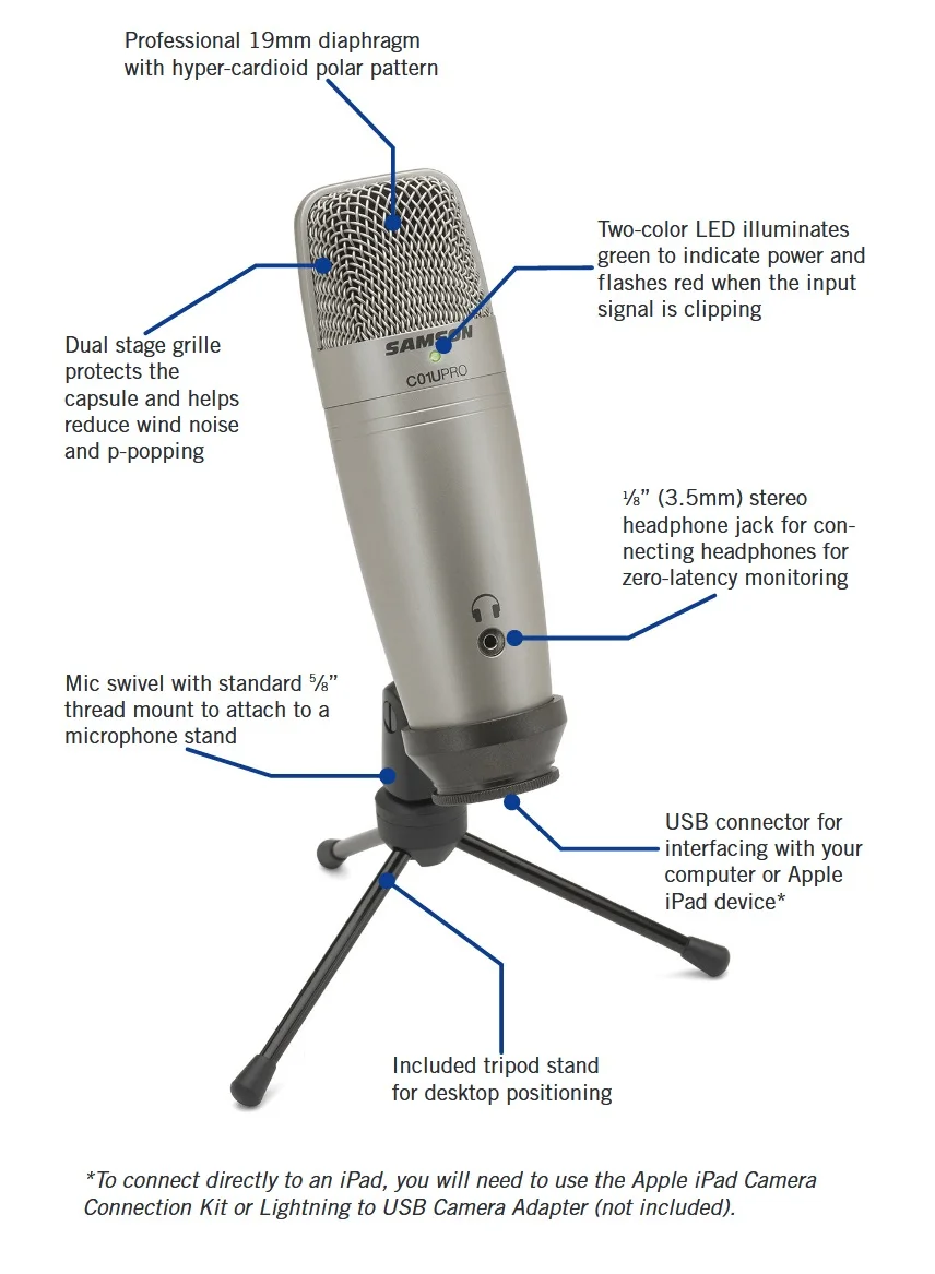 Захвата аудио в 16-бит 44,1/48 кГц разрешение с гладким без каблука амплитудно-Частотная характеристика: 20 Гц-18 кГц, c01U Pro обеспечивает аутентичную проекцию высоких и низких частот для вашего любимого приложения DAW или записи. Кроме того, Samson сохраняет свою давнюю приверженность удобству пользователя с подключением и воспроизведением (без необходимости установки драйвера), usb-питанием через Mac, ПК или iPad (кабель входит в комплект), А также включая штатив-Трипод и поворотное крепление для оптимального размещения рабочего стола. C01U Pro даже совместим с iPads и iPhone (4S и более поздней версии) с помощью адаптера USB Lightning для Камеры Apple или комплекта подключения камеры (30-pin) для тех, кто стремится достичь уровня звука на ходу.
