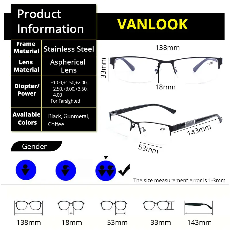Vanlook, деловые дальнозоркие очки для чтения для мужчин и женщин, мужские полуоправы, дальнозоркие очки 1, 2,5, 3, 4