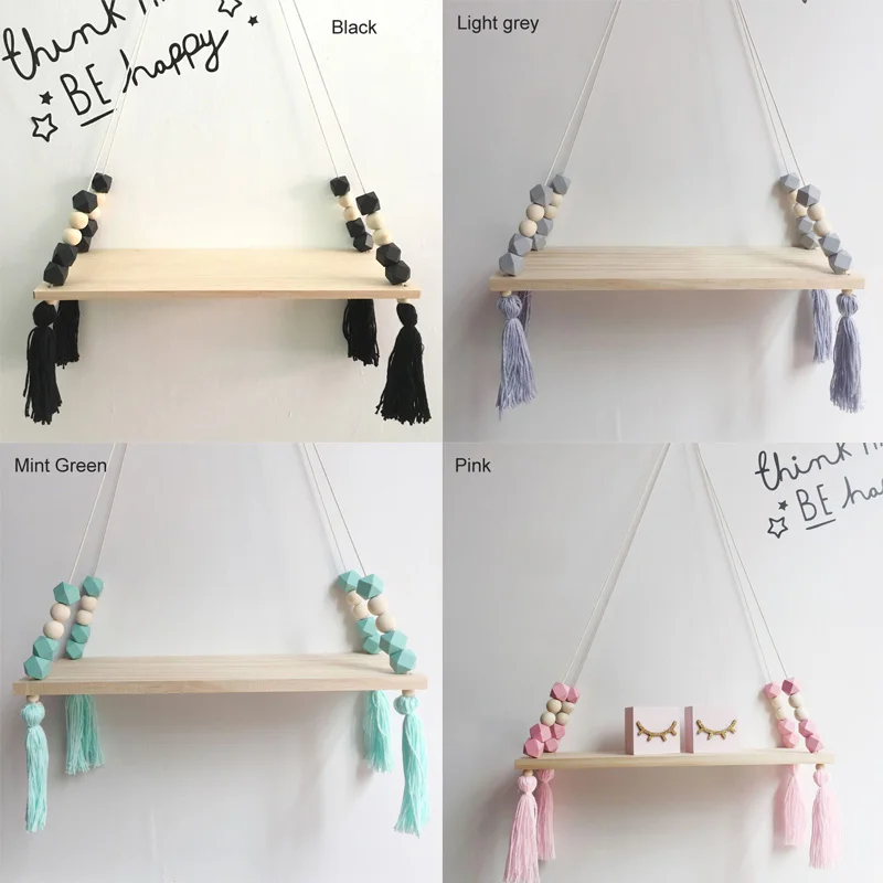 Настенная деревянная полка с бусинами и кисточками, в скандинавском стиле