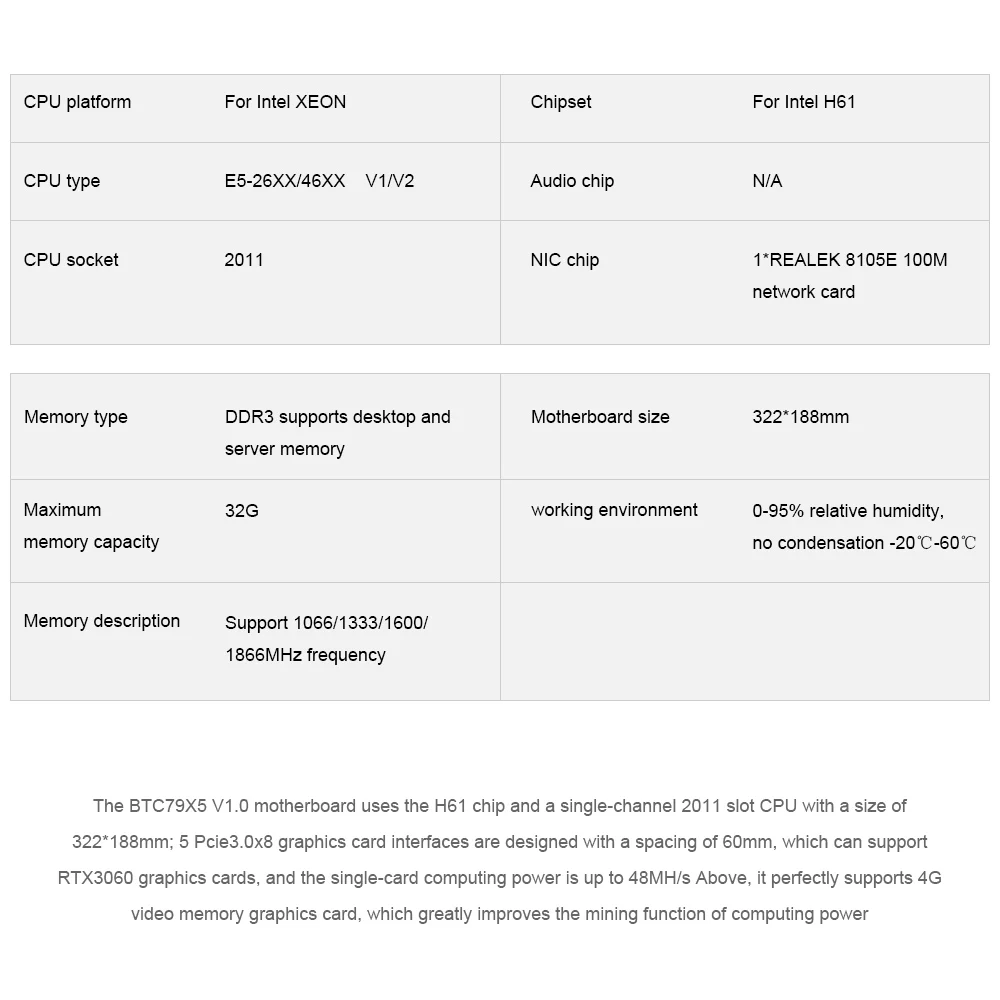 Наименование товара: X79 5 карт Miner материнская плата комплект шассиМатериал: металлЦвет: серебристыйРазмер шасси: approx.505 * 400*175 ммРазмер материнской платы: approx.322 * 188 ммРазмер вентилятора: 12*12*4 смСкорость вентилятора: 5200 об/минИсточник питания: 2000 Вт одиночныйДиапазон напряжения источника питания: 190-220 ВЦП разъем: 1 * LGA (2011)Usb-порт: 4 * USB 2,0USB pin: 1 * USB 2,0Интерфейс жесткого диска: 1 * SATA 3,0Интерфейс жесткого диска: 1 * MSATAИнтерфейс сетевой карты: 1 * LANСлот памяти: 1 * DDR3Микросхема: BGA (H61)Сначала восстановите BIOS: JCMOSГрафический интерфейс: 5 x PCI Express 3,0 8X, шаг 60 ммПитание материнской платы/видеокарты: 6 x POWER_PE (3 входа, 3 выхода)Максимальная емкость памяти: 32 ГБПоддержка частоты памяти: 1066/1333/1600/1866 МГцСамоинициированный вызов: AUTO_ONПамять: поддержка настольного компьютера DDR3 и серверной памятиПрименимый Процессор Модель: для 2630/2620/2609/2603/2630 V2/2620 V2/2609 V2/2603 V2Рабочая среда: 0-95% относительная влажность, без конденсации, -20 °C ~ + 60 °CКоличество: 1 комплект