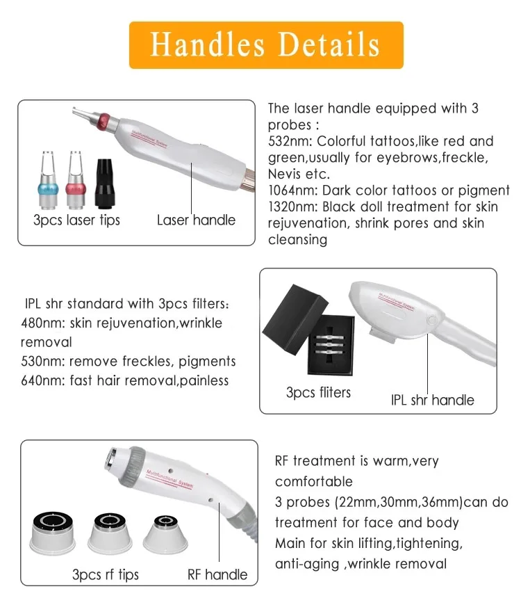 Упаковочный лист: 1. Лазерная ручка X 1 2. Ручка E-Светильник X 1 3. Ручка RF 4. Фильтр X 5 , RF head X3 5. IPL и лазерные защитные очки X 4 6. Ножной переключатель X 1 7. Руководство/инструкции на английском языке 8. Воронка x1