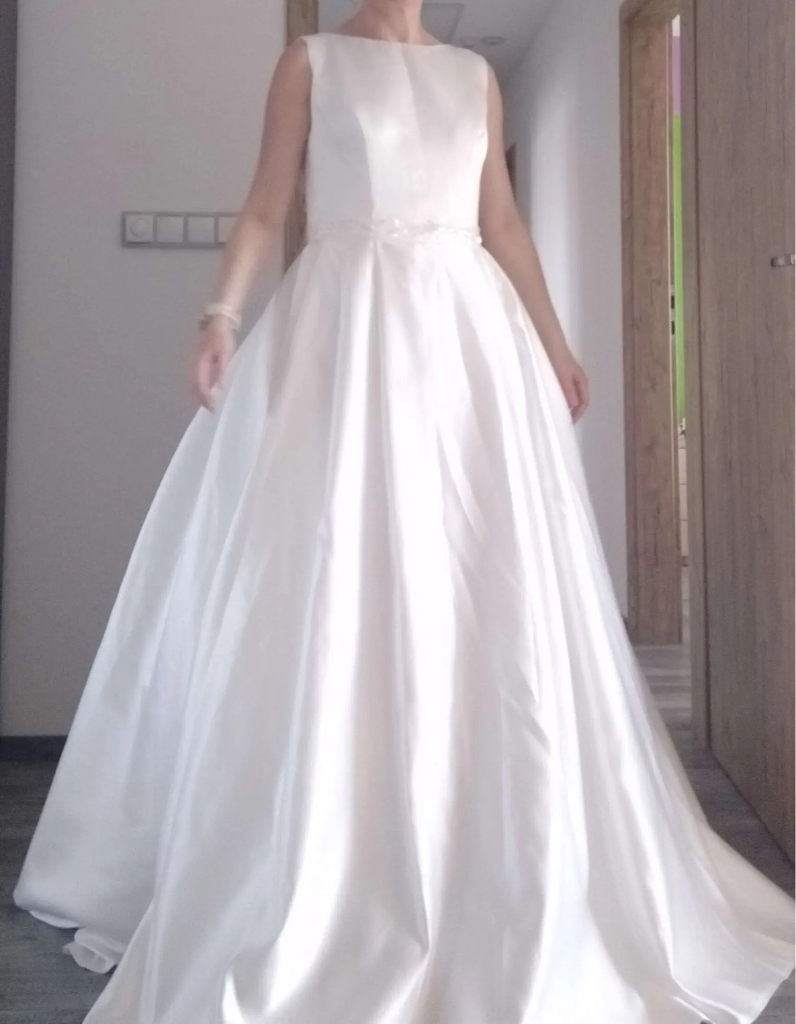 Платье свадебное атласное ТРАПЕЦИЕВИДНОЕ без рукавов с поясом с кри...
