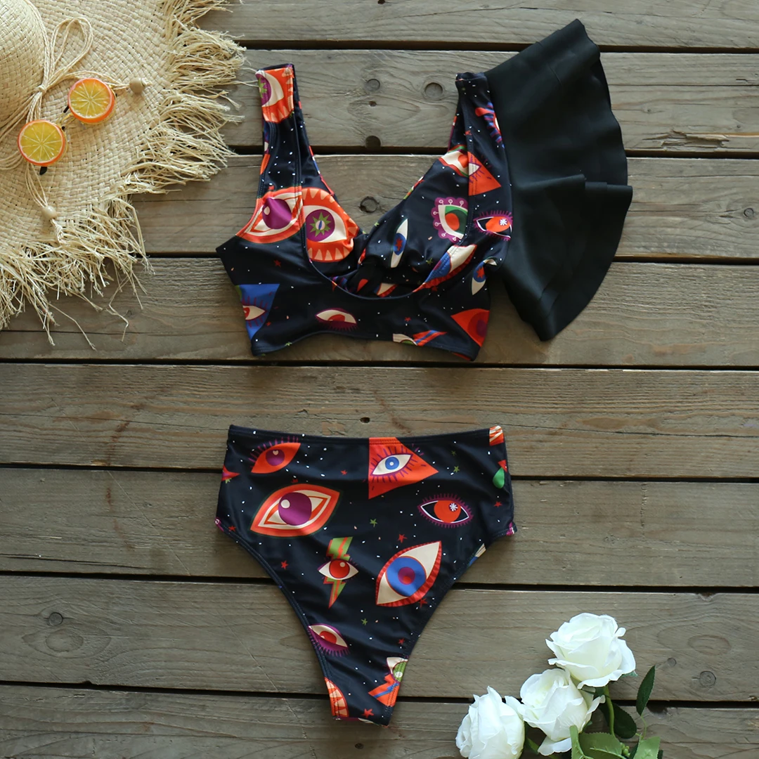 Новинка 2022, женский купальник с принтом в виде привлекательных глаз, комплект бикини с оборками, купальные костюмы с высокой талией для купального костюма