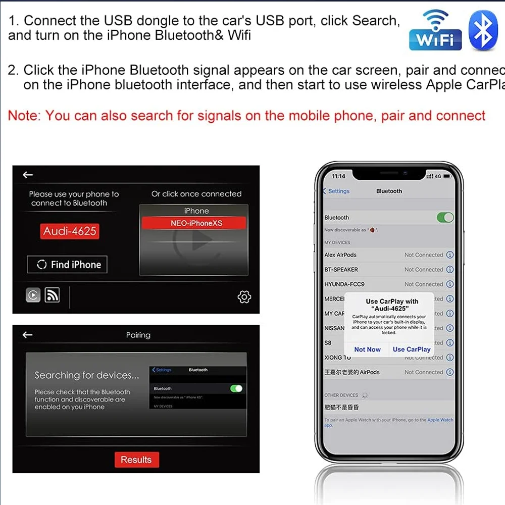 ==========================★Беспроводная CarPlay: сопряжение через Bluetooth и передача через WIFI.★Проводной CarPlay: сначала выключите WIFI и подключите через кабель (вы также можете зарядить свой телефон через кабель)