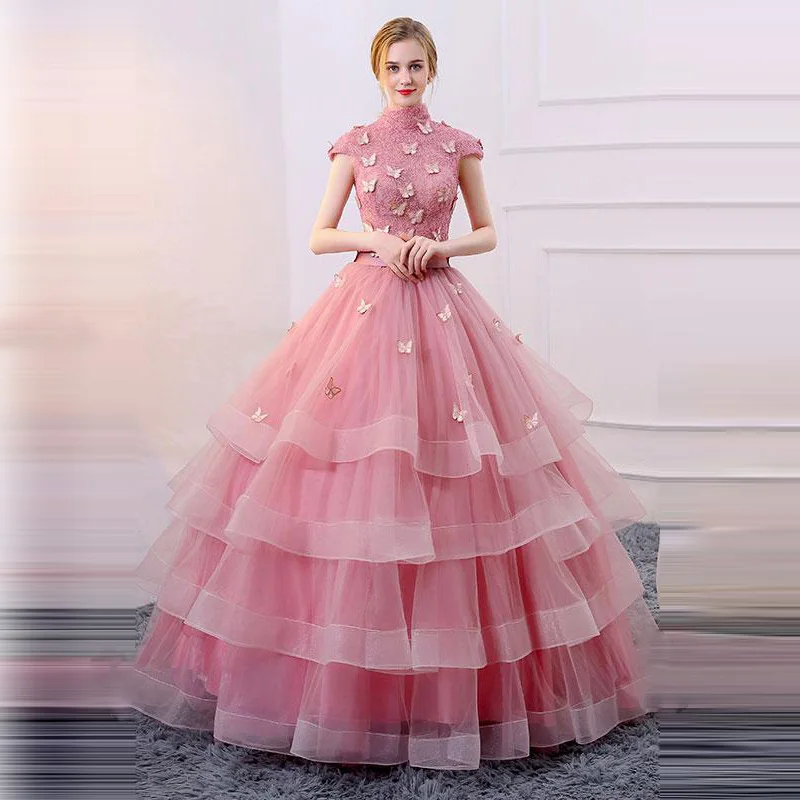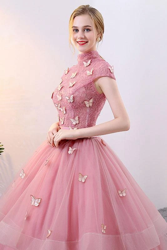 Светло-розовое платье-трапеция с высоким воротником, вечерние платья без рукавов с аппликацией, длинные платья для выпускного вечера, платья до пола, платье с бабочкой