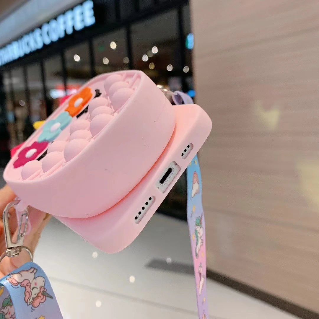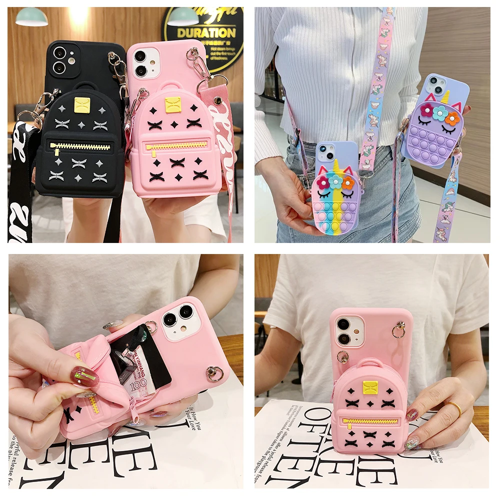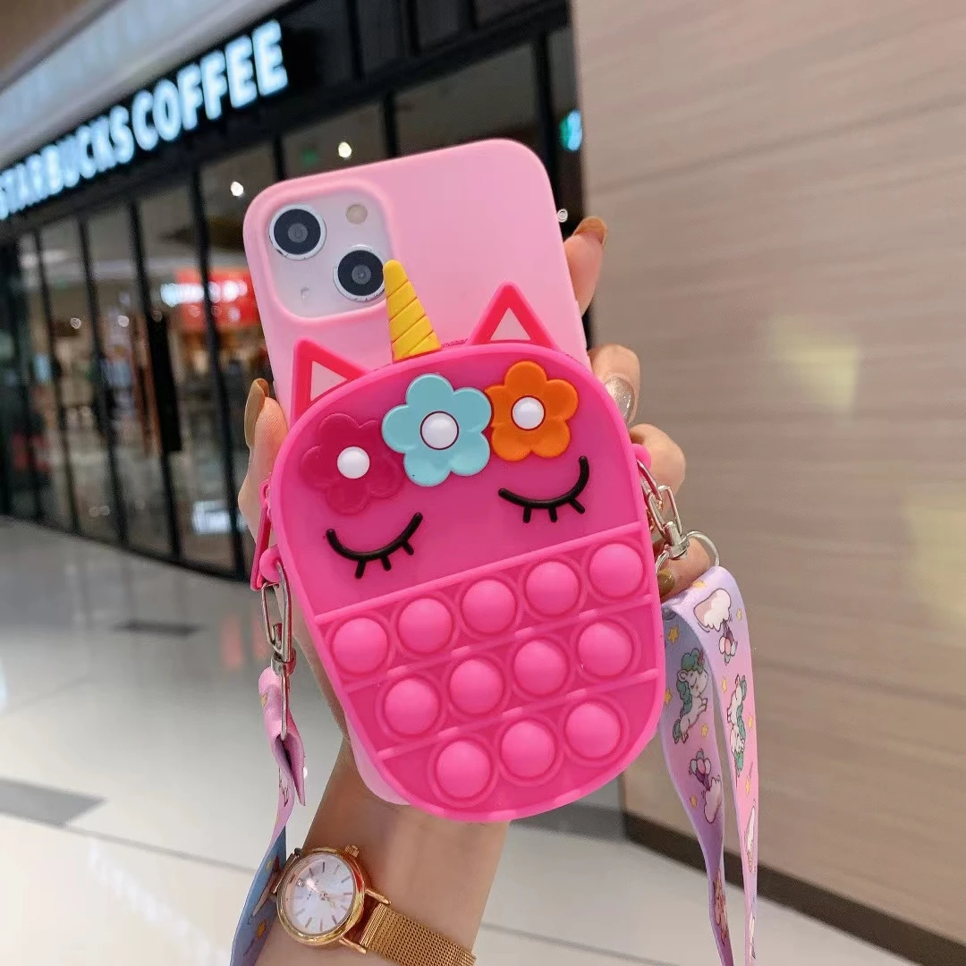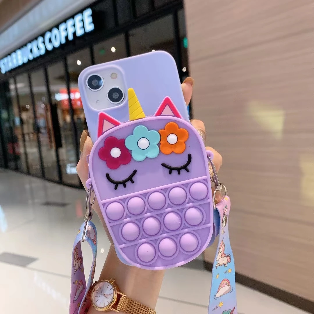 Features3D Cartoon Rainbow Unicorn Coin Purses Wallet Card Holder Case Pop Fidget Toys Push Bubbles Relieve Stress with Neck Strap Rope Lanyard