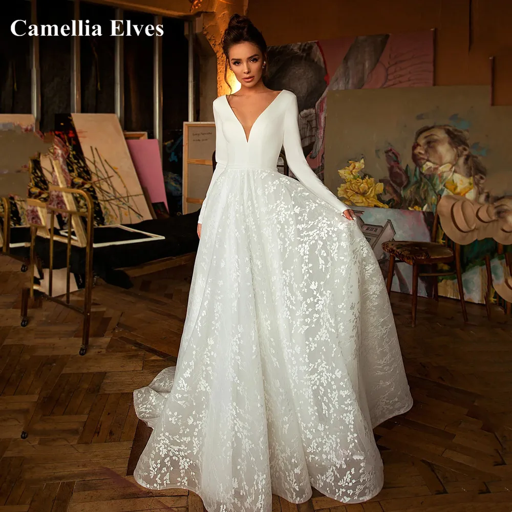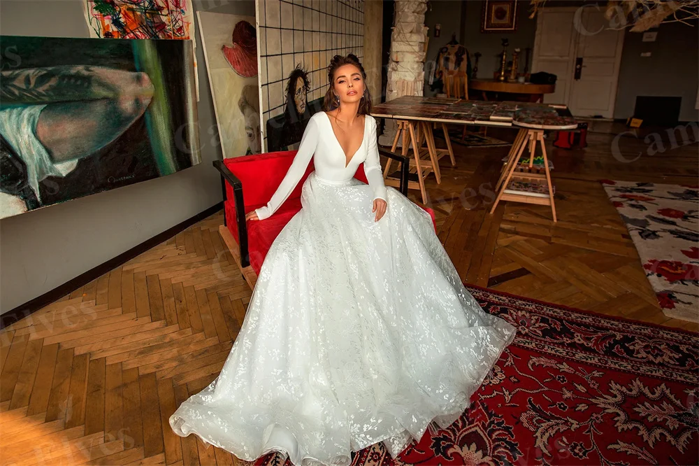 Женское атласное свадебное платье-трапеция, элегантное привлекательное белое платье невесты с V-образным вырезом и длинным рукавом, свадебное платье, 2022