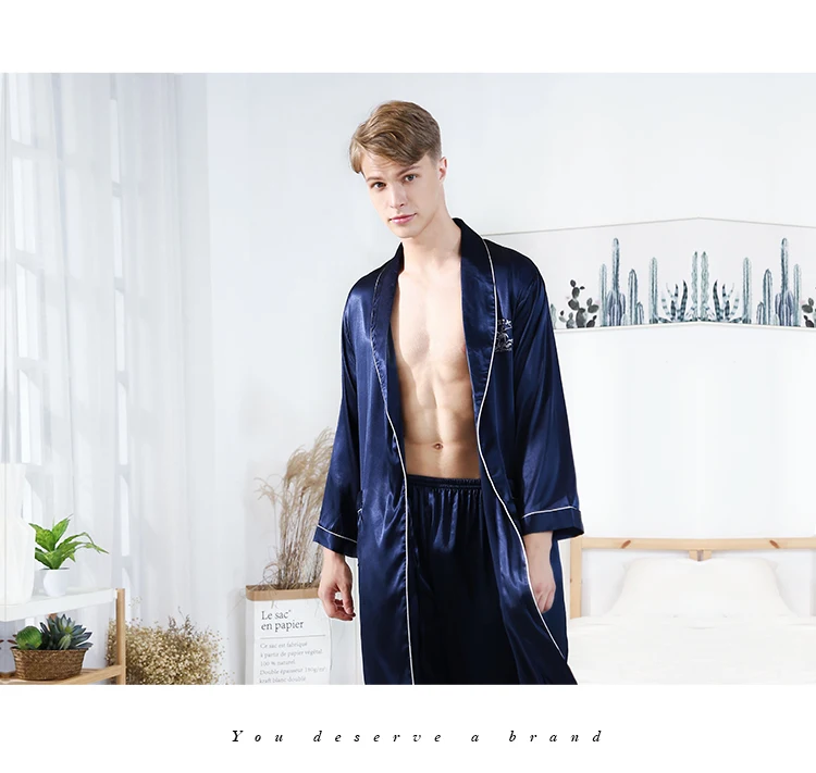 Мужская Ночная рубашка-кимоно, халат из искусственного шелка, домашняя одежда, атласная одежда для сна, халат и штаны, комплект из 2 предметов для пижамы с принтом