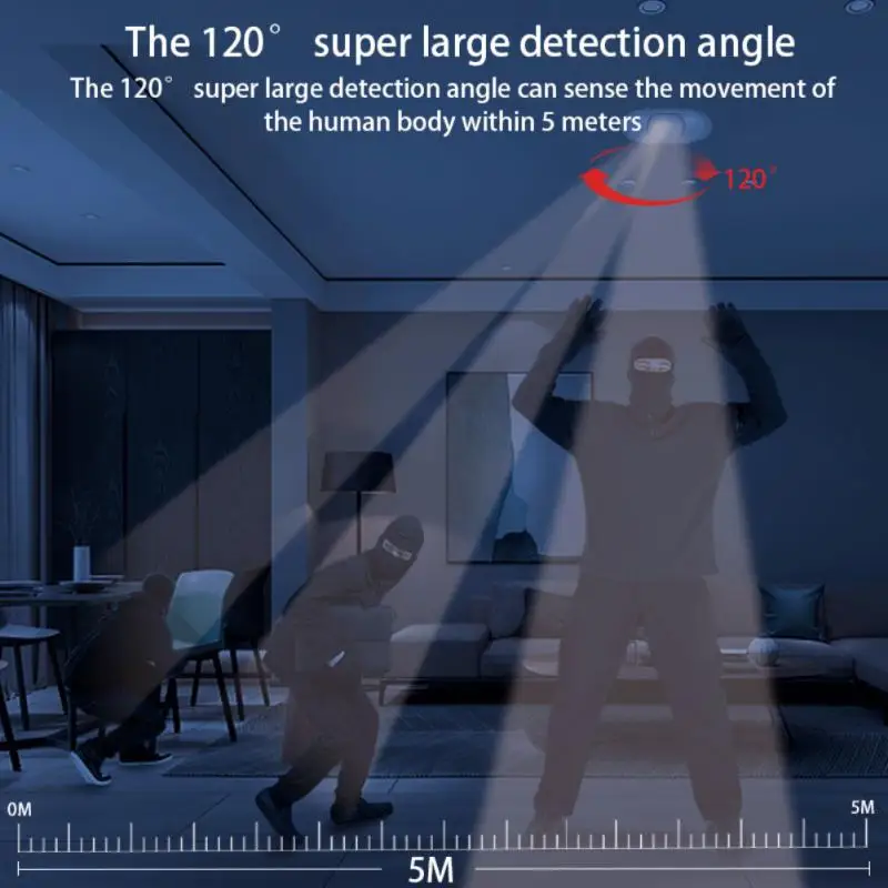 Супер большой угол обнаружения 120 ° может почувствовать движение человеческого тела в пределах 5 метров и спокойно записывать каждый момент.