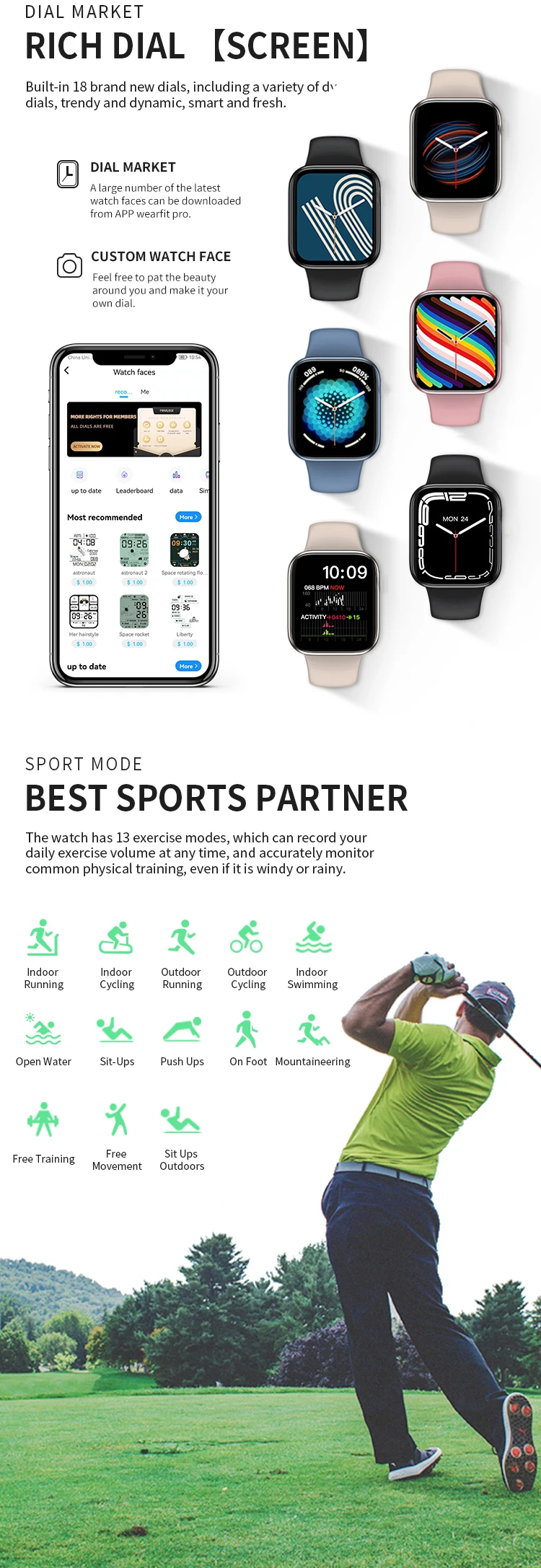 1. Следите за своим здоровьем:Пульс/кровяное давление/кислород в крови/глюкометр в крови, трекер сна, напоминание о малоподвижности.2. Хороший помощник для тренировки:Шаги, сожженные калории, расстояние, спортивный режим.3. Хороший помощник для повседневной жизни:Телефонные звонки, синхронизация уведомлений, NFC (Touch and Go) для контроля доступа, блокировка паролей, обновления OTA, Bluetooth совместимая музыка, дыхательные упражнения, поднятие до пробуждения, калькулятор, будильник, секундомер, пользовательские лица, найти мой браслет, погода, регулировка яркости, часы лица рынок, сплит-экран, 3D динамические лица и т. Д.