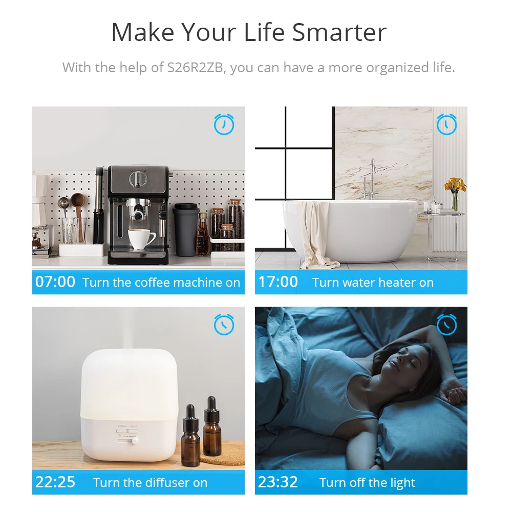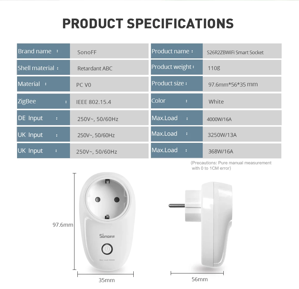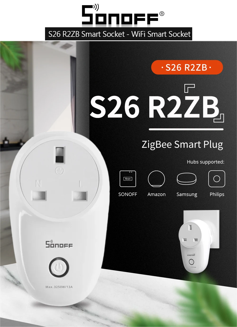 SONOFF S26R2ZB-Умная вилка ZigBee со стандартом Великобритании/DE/FR. Пользователи могут мгновенно преобразовать обычную вилку в смарт-вилку, она может работать с другими смарт-устройствами, такими как включение/выключение при температуре, сделает вашу жизнь умнее.S26R2ZB может работать как маршрутизатор ZigBee для передачи сигнала между устройствами. Не нужно беспокоиться о проблеме, вызванной длительным расстоянием.S26R2ZB может подключаться непосредственно к совместимым концентраторам Zigbee, включая SONOFF ZBBridge, Amazon Echo 4th gen, Samsung SmarThings Smart Hub, Philips Hue. Штепсельные вилки SONOFF S26R2ZB также работают со встроенными устройствами smart hub, такими как Amazon Echo 4th gen.С помощью этой смарт-вилки вы можете управлять домашними устройствами в любом месте, в любое время.Примечание:1. Стандарт ЕС разделен на EU-F и EU-E, пожалуйста, внимательно проверьте, какой из них подходит в вашем доме.2. S26R2ZB должен работать с шлюзом Zigbee, рекомендуем наш мост Zigbee.