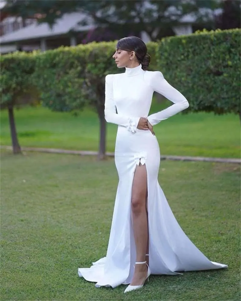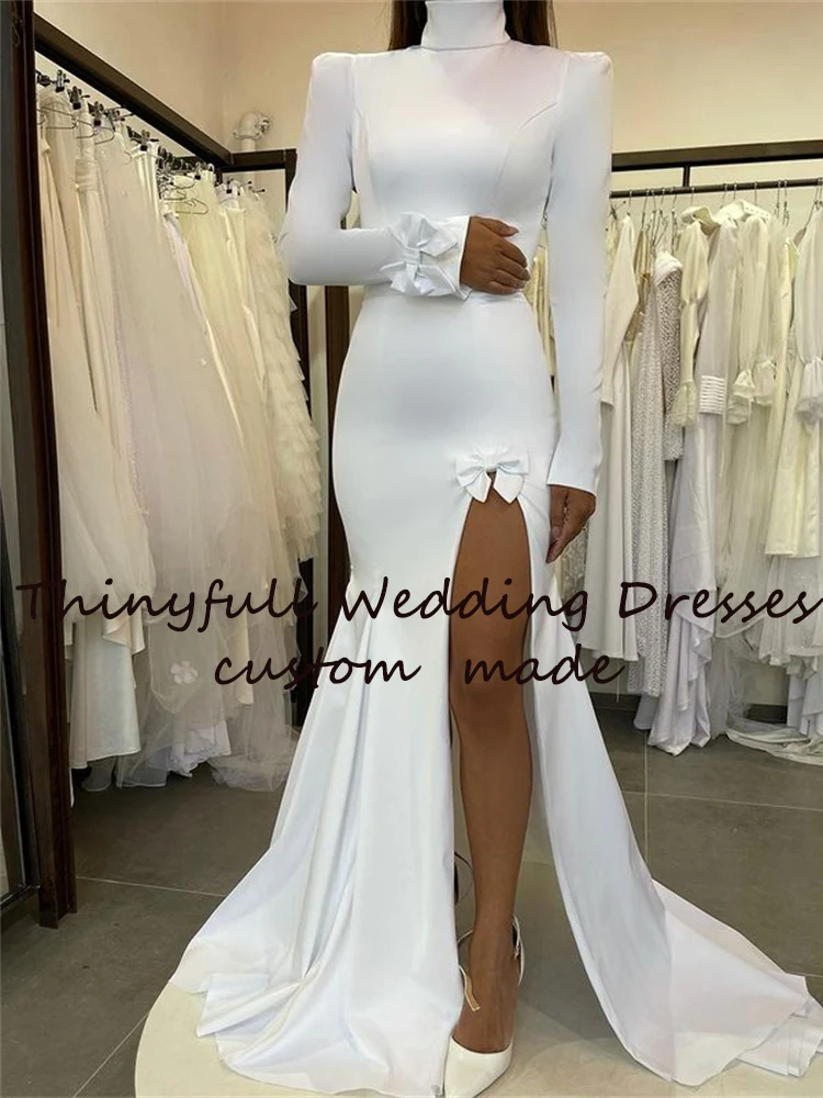 Женское свадебное платье-Русалка Thinyfull, белое пляжное платье с бантом и длинными рукавами, платье с разрезом сбоку и высоким воротником для невесты