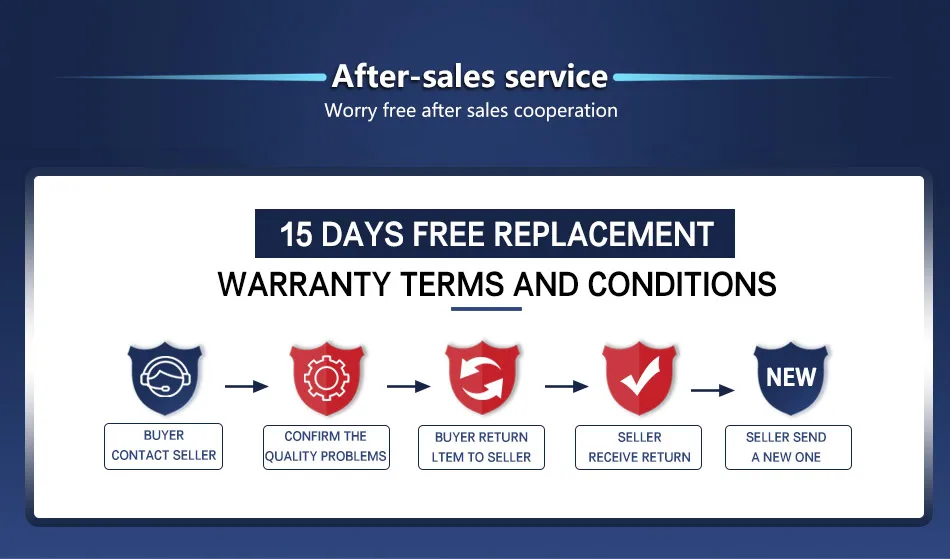 4. Если продукт имеет проблему в течение 15 дней после подтверждения получения, мы заменим новый продукт для вас. Но сначала свяжитесь с нами, чтобы решить проблему после продажи. Эта гарантия не распространяется на ущерб, причиненный в результате аварии, неправильного использования или модификации продукта.