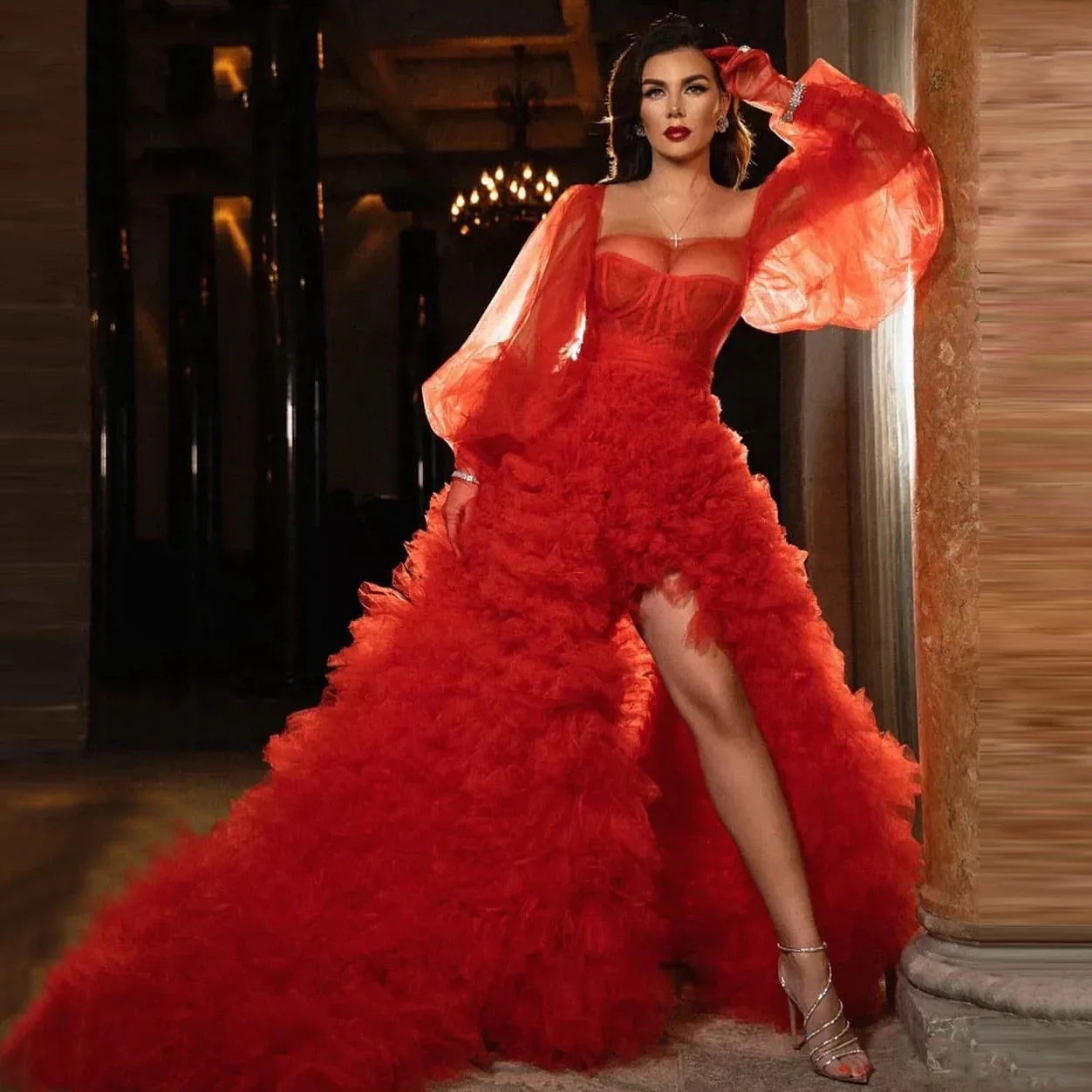 Красные Многослойные тюлевые платья для выпускного вечера 2022 платья для вечеринки прозрачные с длинными рукавами пышные тюлевые женские платья для фотосъемки на заказ