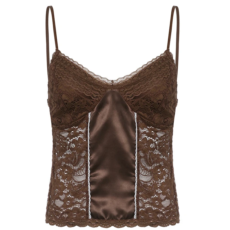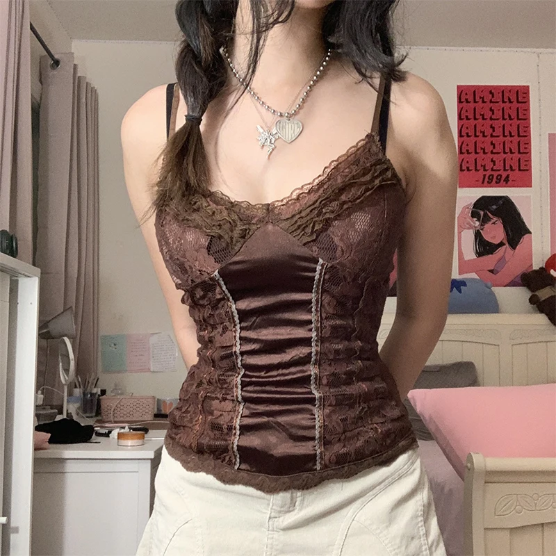Милые коричневые кружевные кроп-топы с оборками, атласный Заплатанный мини-жилет, Майки с открытой спиной и V-образным вырезом, женские милые Ретро корсеты, толстовки, топы