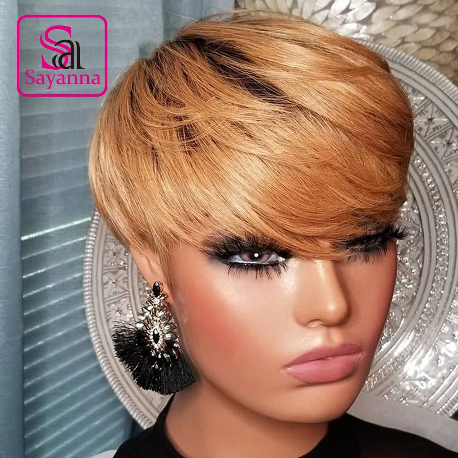 Блонд, цвет Омбре, короткий парик, обрезанный Пикси, дешевые человеческие волосы, парики, прямой Боб, парики с челкой, полный машинный парик из человеческих волос для женщин