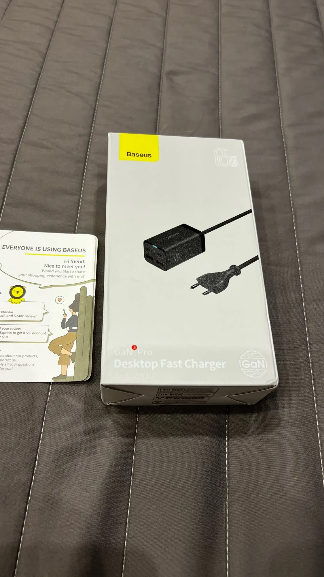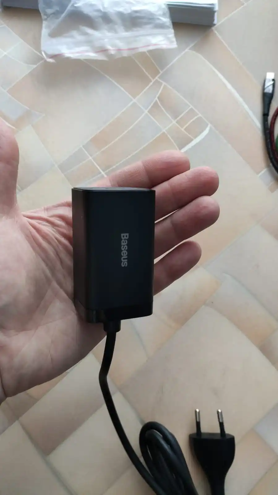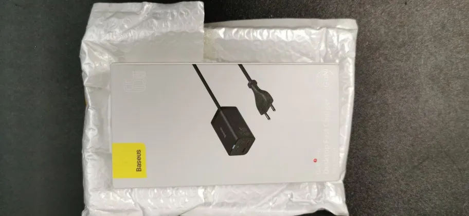 Быстрая доставка - 2 недели. Упаковка немного помята, но незначительно. Коробка из довольно плотного картона, поэтому товар внутри в полном порядке. Блок тяжёлый, провод толстый - всё выглядит очень качественно. Зарядка работает. Спасибо Baseus