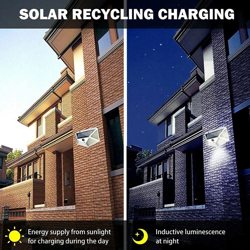 100LED Солнечный водонепроницаемый четырехсторонний индукционный настенный светильник для человеческого тела, переключаемый на переднюю панель, прост в эксплуатации, и добавлен индикатор-светильник, энергосберегающий и экологически безопасный, зеленый светильник, длительный срок службы, долговечность, низкий уровень неисправности, высокая стабильность излучения, простая установка (Только нужно 2 винта можно зафиксировать на наружной стене, которая может быть загорается от солнца. Он прост в использовании, интеллектуальный светильник с датчиком, без регулировки, энергосберегающий и удобный, что делает ваш дом более красивым и умным.