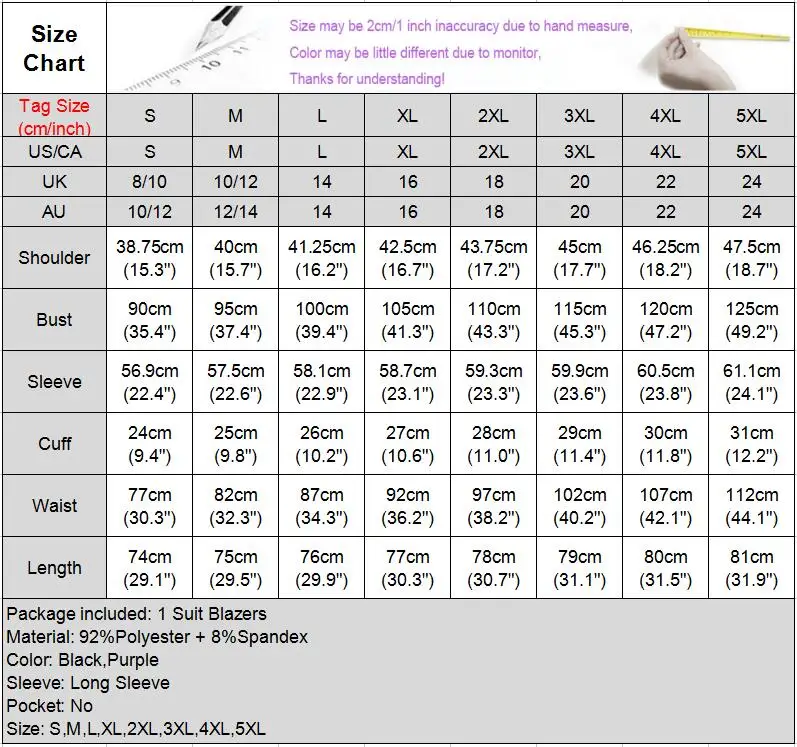 Посылка включает в себя: 1 костюм с блейзеромМатериал: 92% полиэстер + 8% спандексЦвет: черный, фиолетовыйРукав: длинный рукавКарман: нетРисунок: однотонныйОсобенности: кнопка, СращиваниеСтиль: Отдых, отдых, праздник, Европа, Повседневный, модныйСезон: весна, осеньПовод: вечерние, праздничные, уличные, дорожные, повседневные, семейные, вечерниеВнимание:1. Перед покупкой, пожалуйста, проверьте размеры в таблице размеров!2. Размер может быть неточным на 2 см/1 дюйм из-за ручного измерения, цвет может немного отличаться из-за монитора, спасибо за понимание!3. Предложение холодной воды ручная стирка. Это может помочь предметам сохранить свою форму.